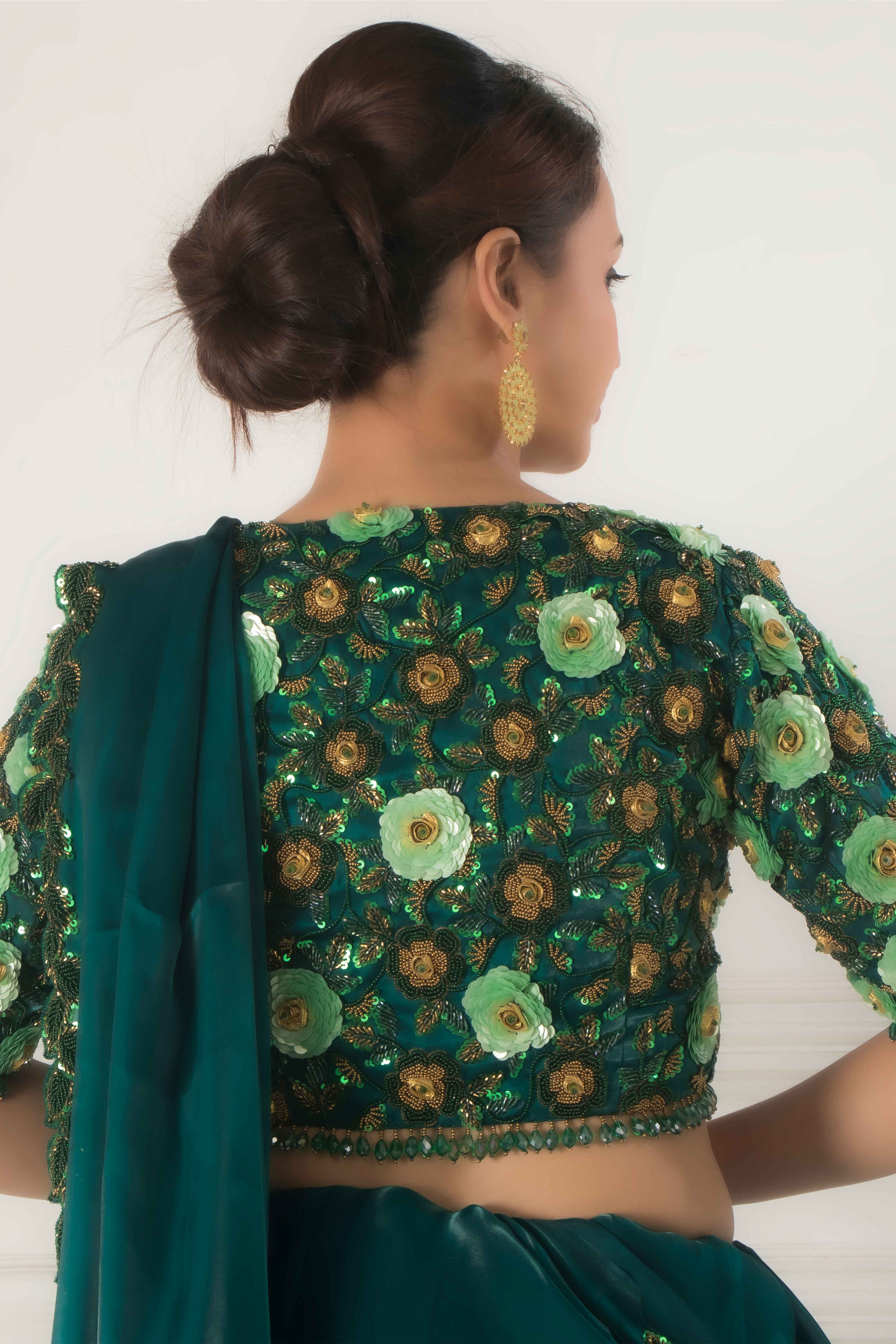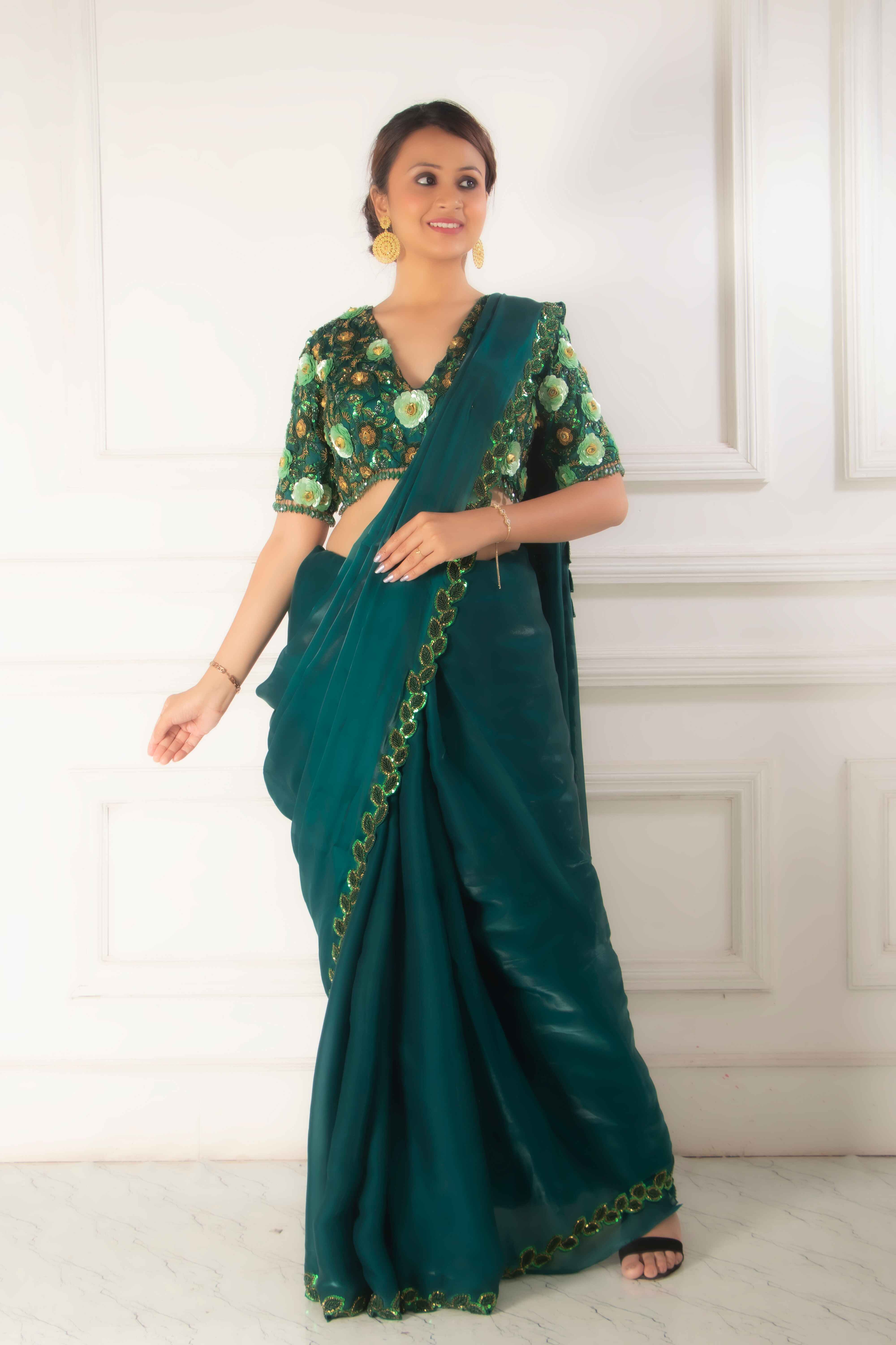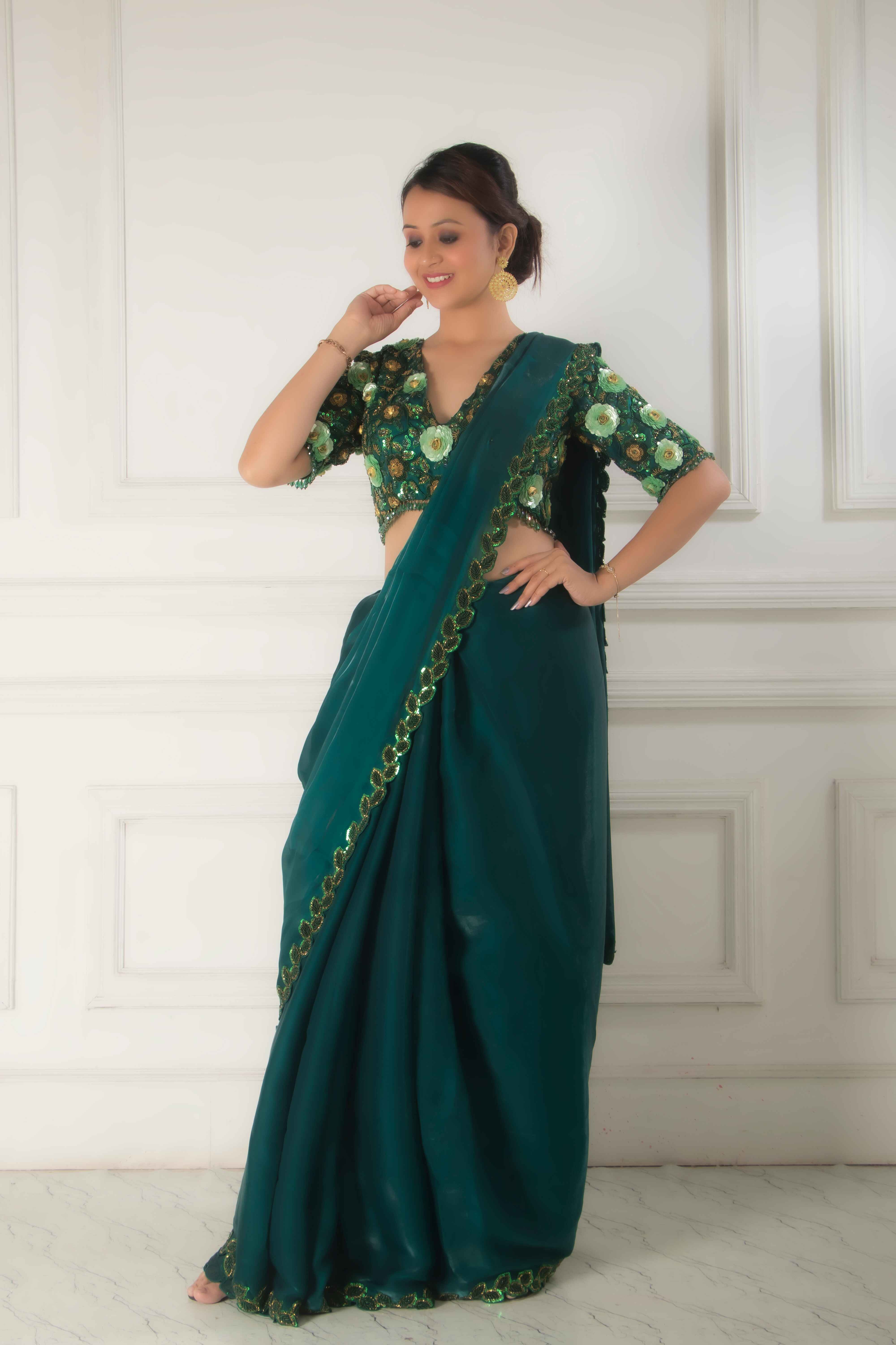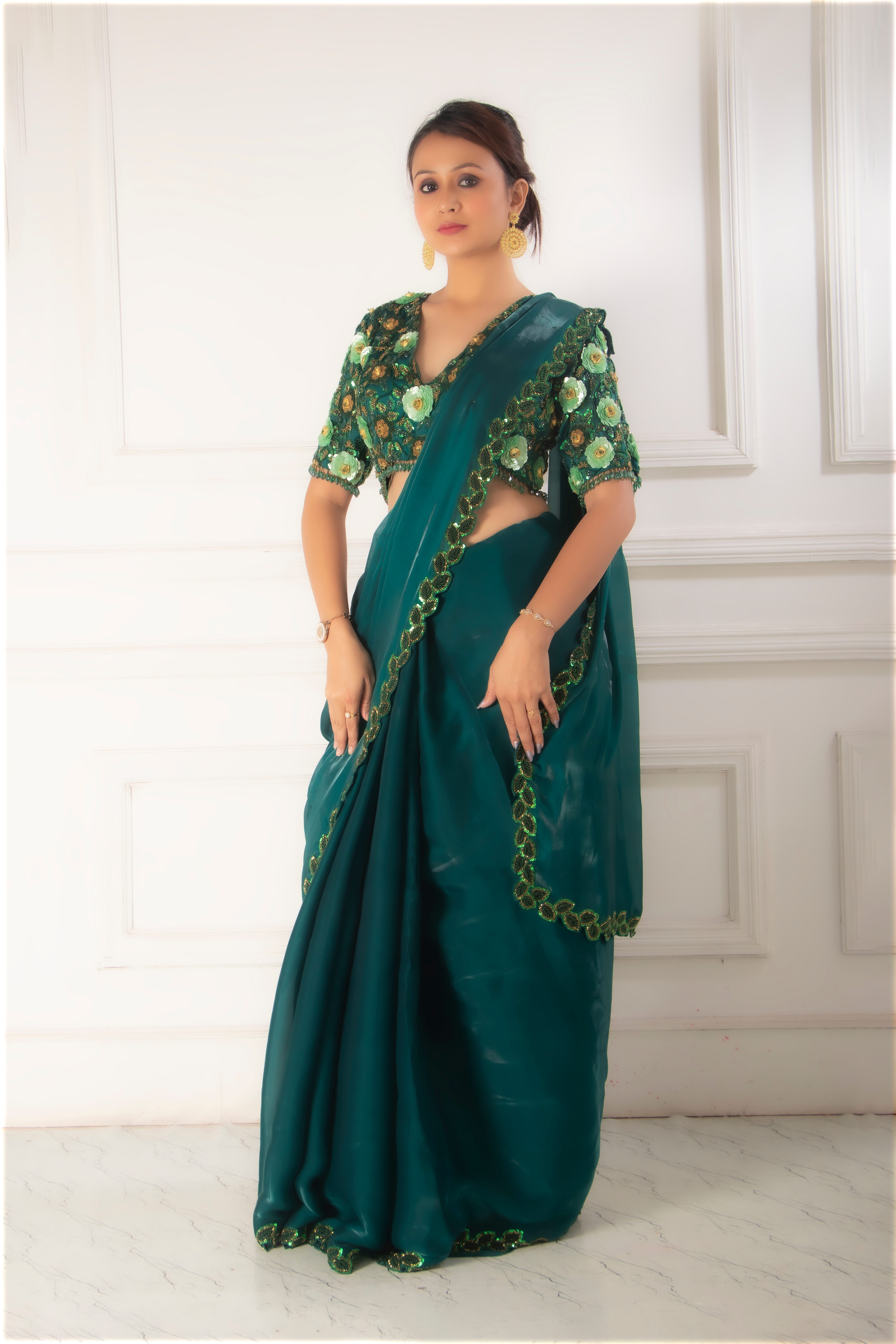 This luxurious set consists of a beautiful emerald green saree made of delicate organza fabric which gives a light sheer saree look adorned with gorgeous floral embroidery, add elegance and charm. Complete the look with a blouse that goes well with a V-neck for a beautiful look. This set combines evergreen colors with intricate details. This makes it ideal for any special occasion where you want to make a memorable impression.