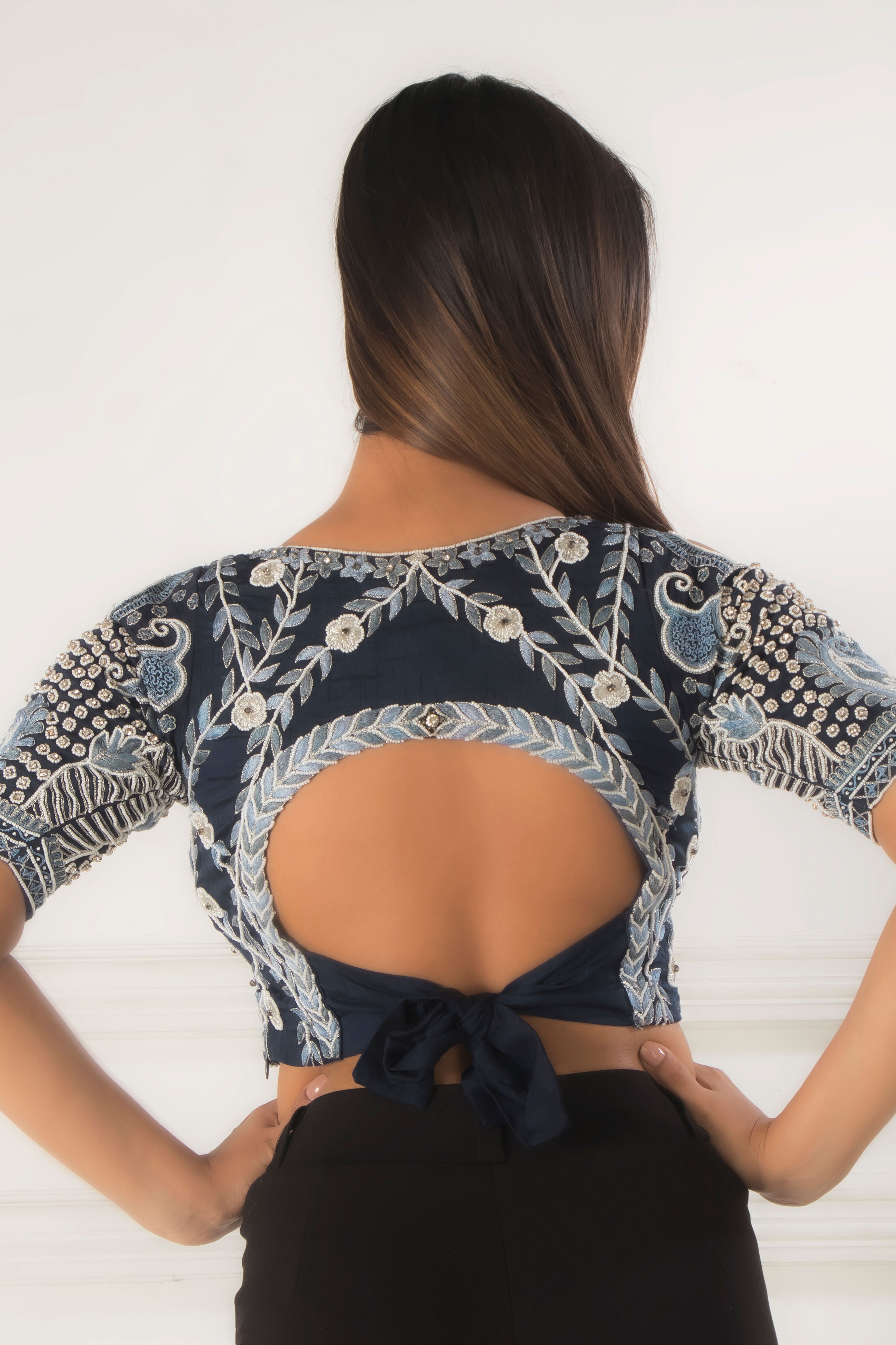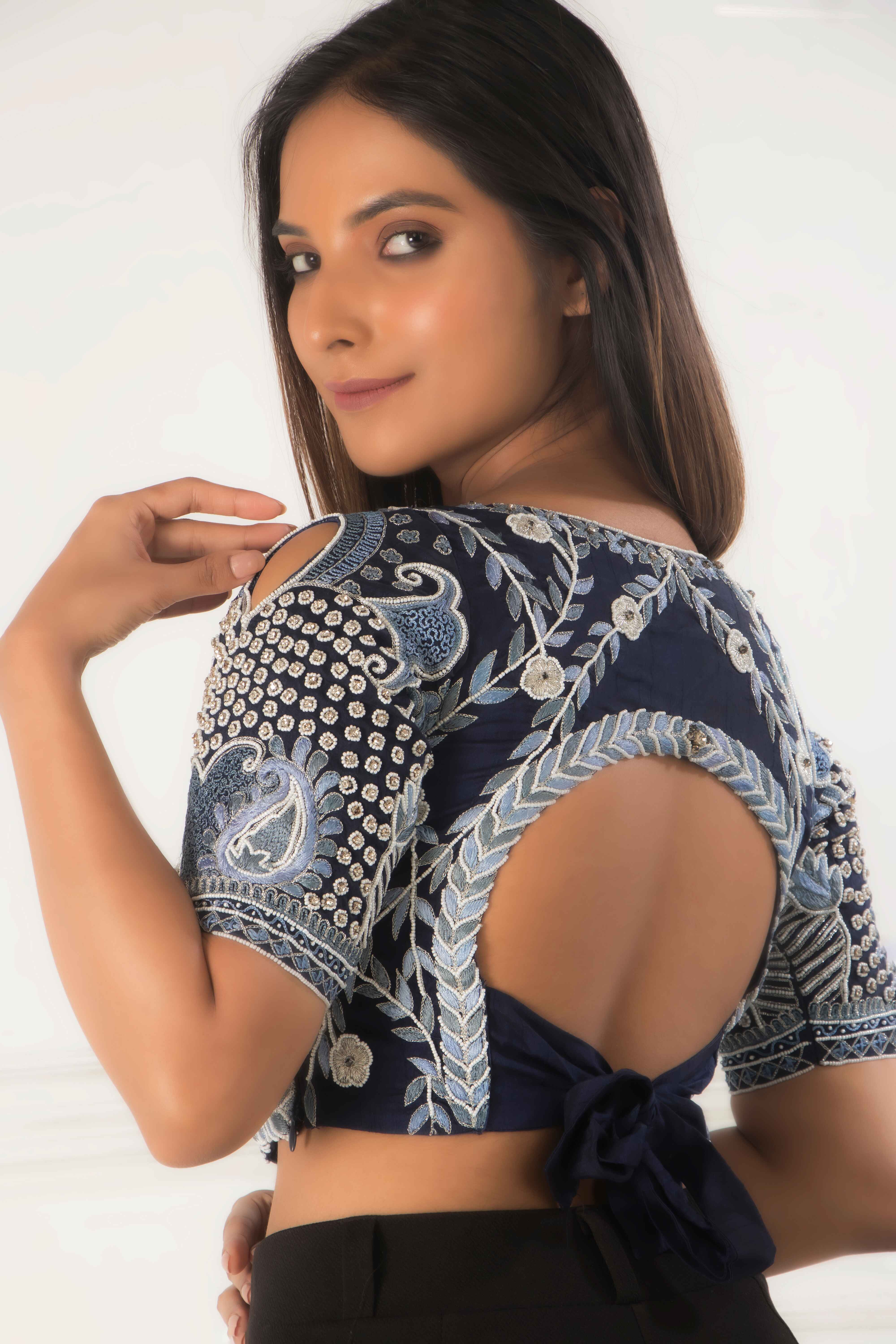 This elegant blouse features navy silk. It is decorated with delicate floral embroidery that adds timeless elegance. The U-shaped neckline adds to the classic charm. while hand beaded details and a tie back give it a modern look. Perfect for pairing with your favorite saree. This blouse combines refined craftsmanship with a contemporary design for Looks chic and sophisticated…and it happens.