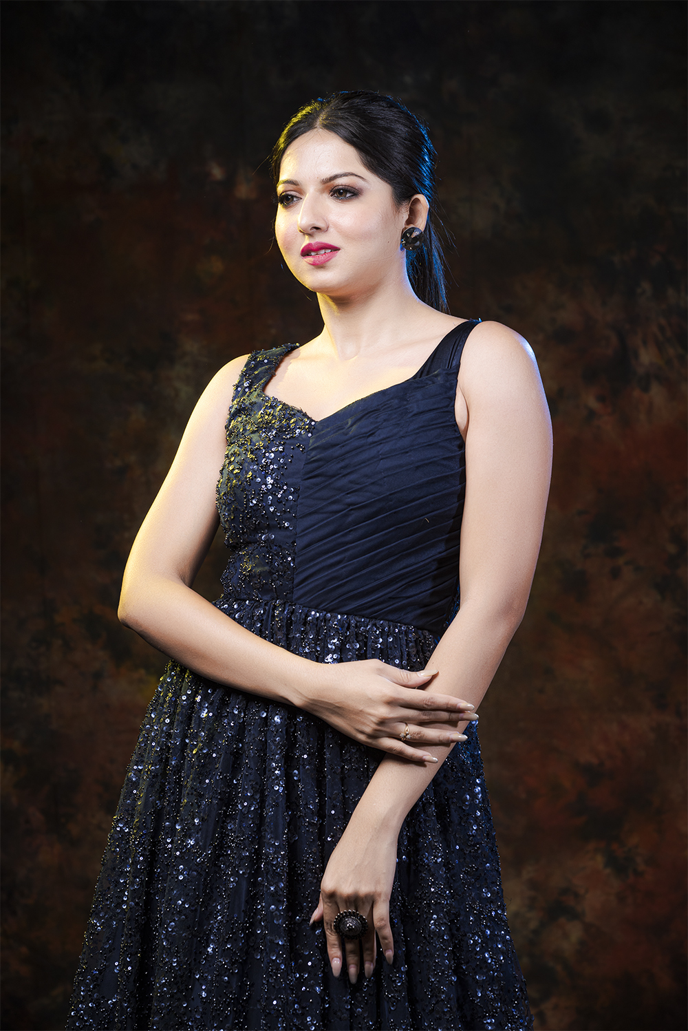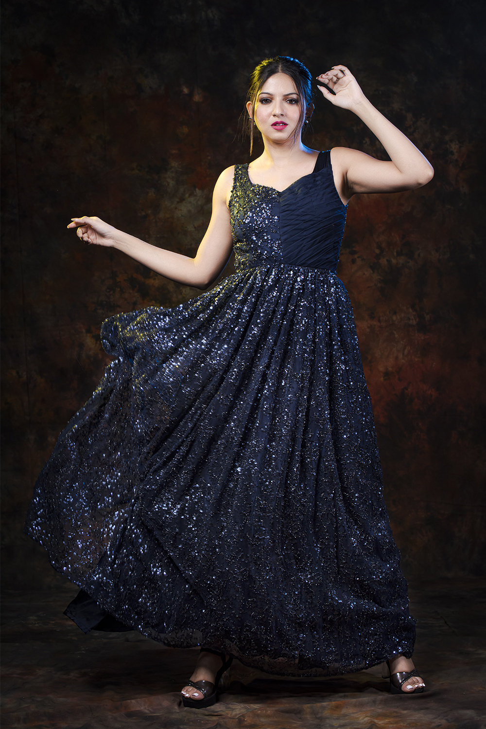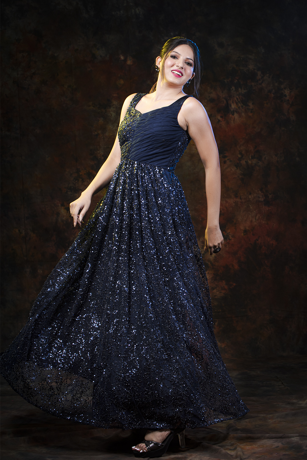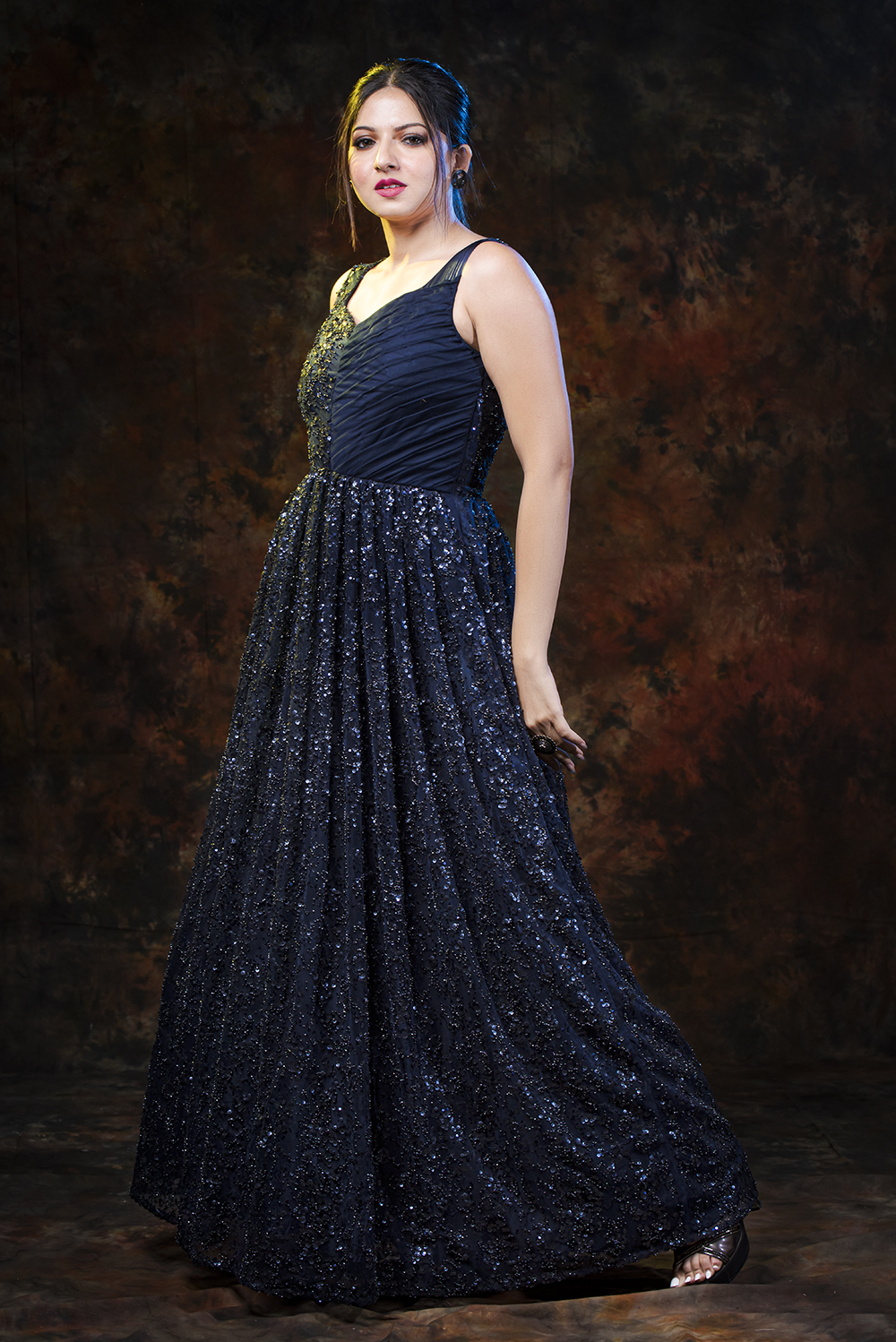 Make yourself look like an absolute diva with this lavish midnight blue gown form Zariah. This gorgeous ball gown is made up of rich fabric consisting of sequin embroidery net that flaunts your collar and arms. This gown is perfect for elite high fashion wear that makes you look impeccably sensual.
