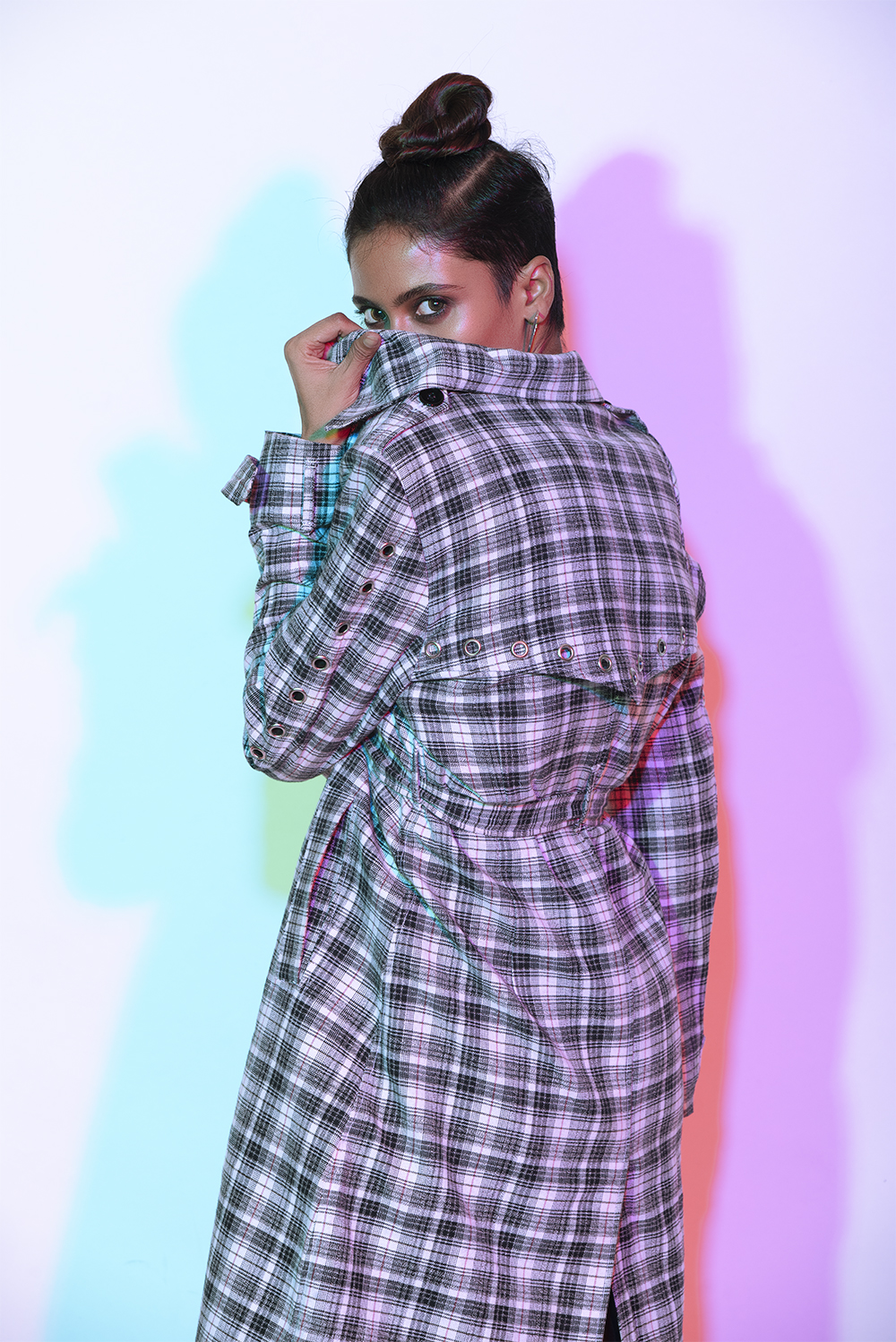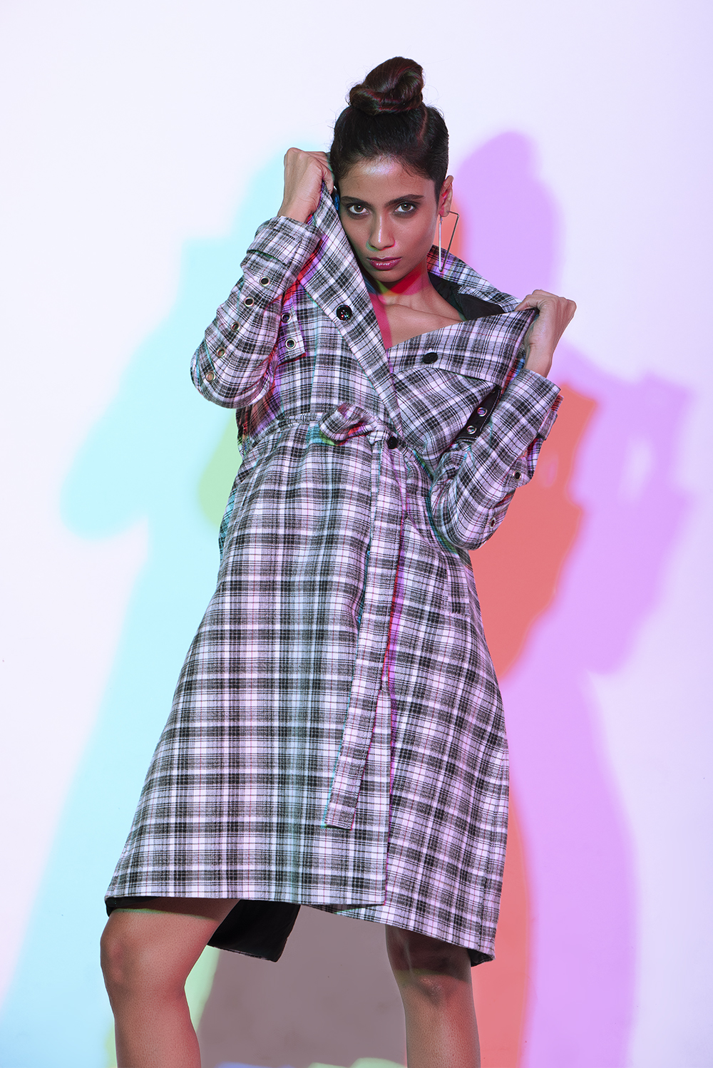 Amp up your style quotient with this tartan plaid cotton fabric trench dress with pockets. This sharp look adds an oomph to your formal street wear. The front button-down over-lap pattern dress with fabric belt cinch your tiny waist. What makes it more attractive is the decorative piece of punched eyelets on it, a perfect wear of sophistication.