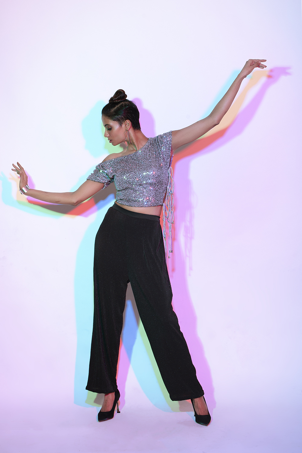 The silver sequin crop top with one drop down shoulder and tie-ups at side seam is a perfect wear fo...