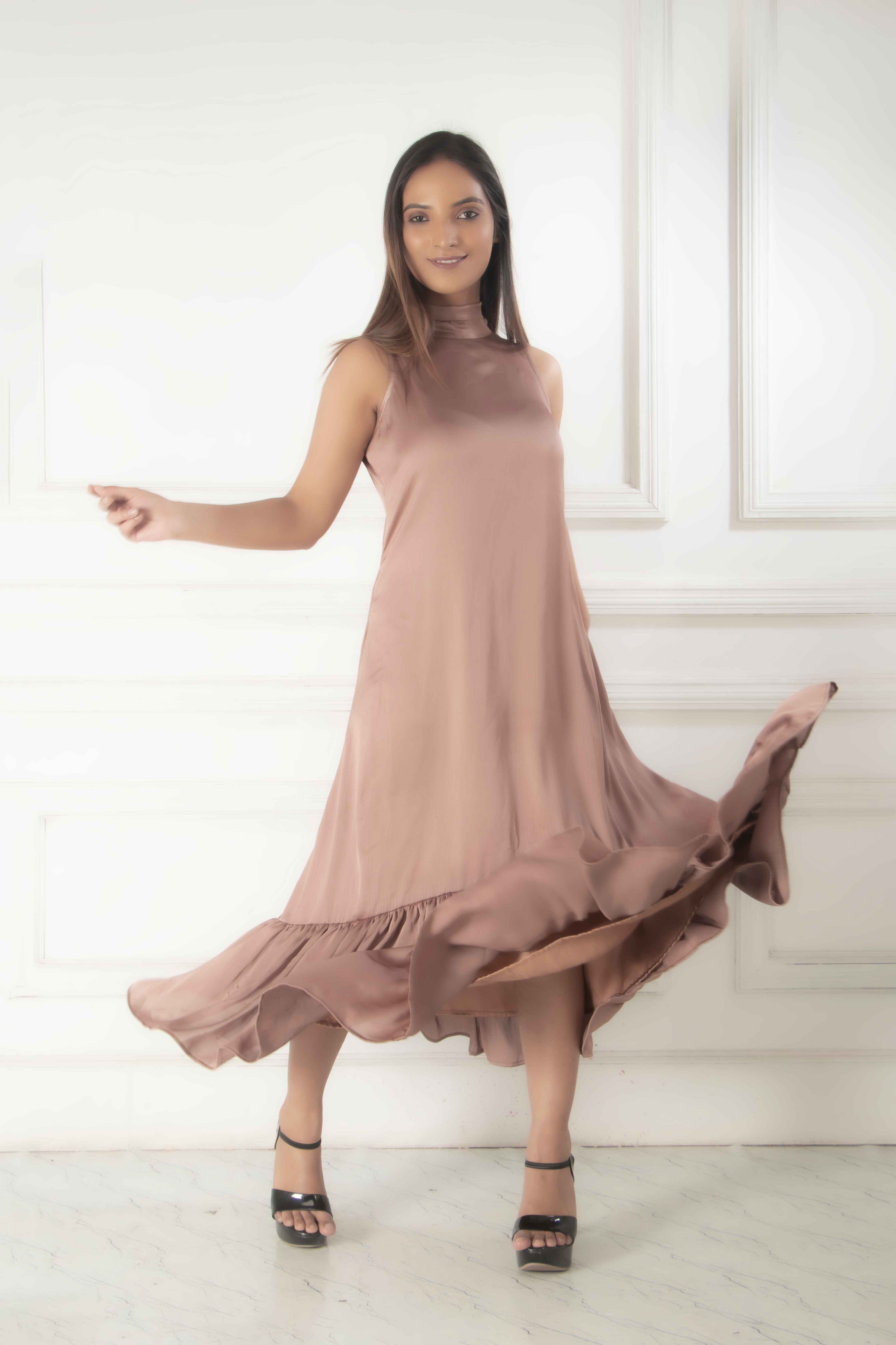 Introducing our Earthy Brown Dress, featuring a stylish halter neck with a chic tie-up detail. Desig...