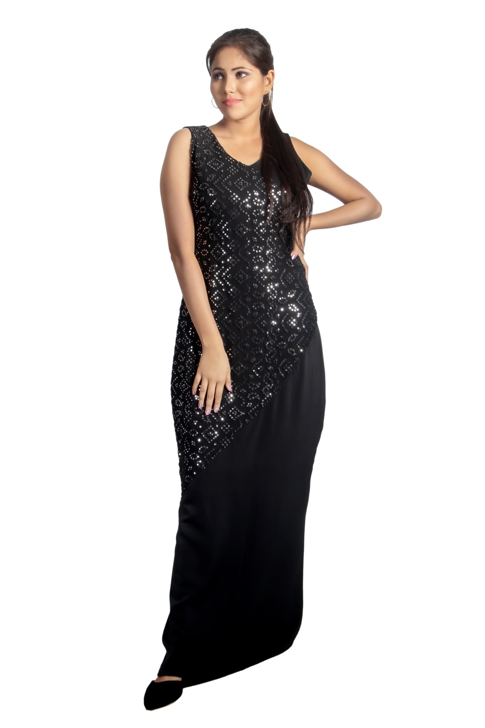 Make your style statement high & clear with black on black A-line style gown with V-neckline.