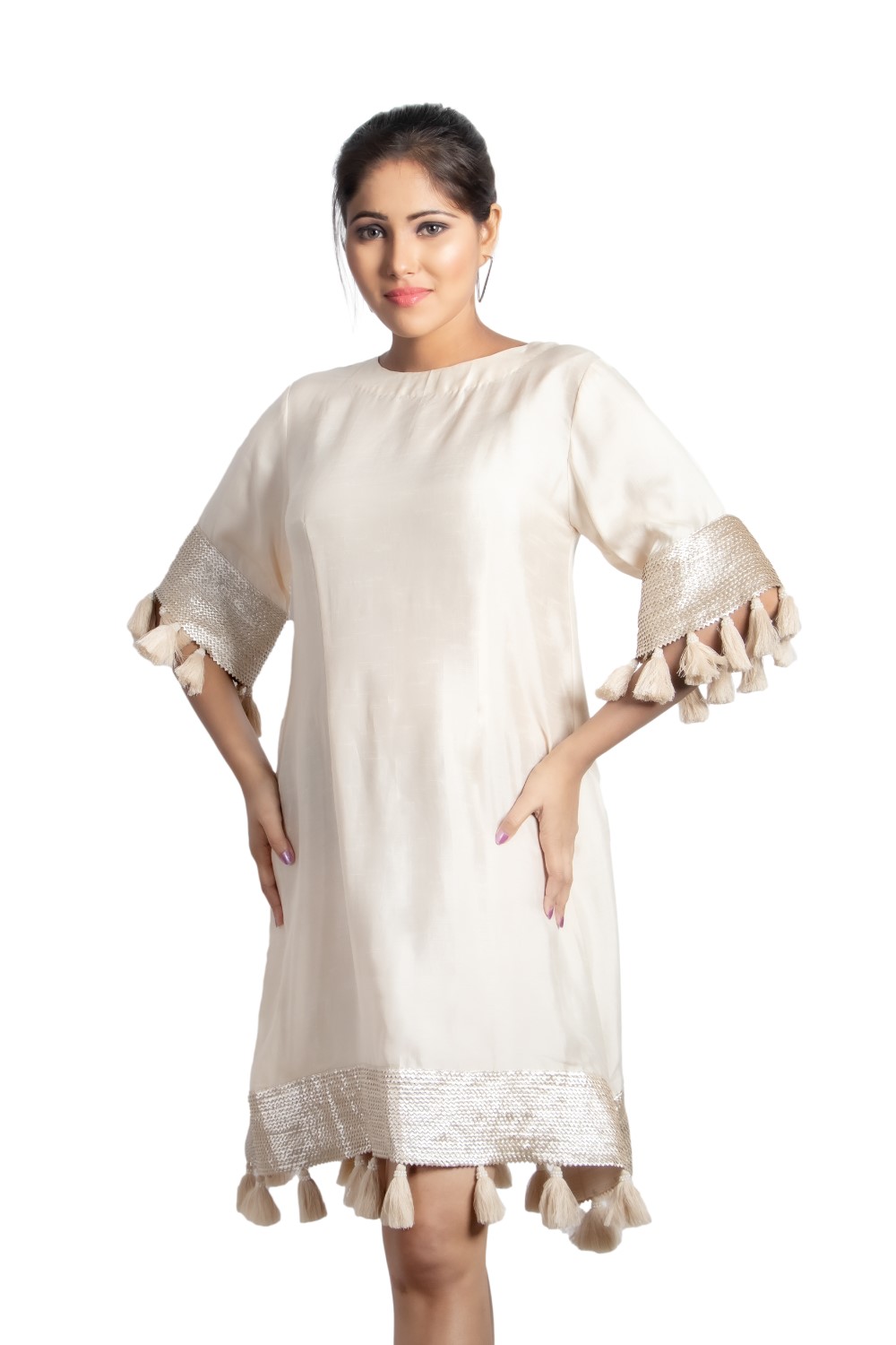 Get brunch ready with the beige A-line dress with tassel detailing.