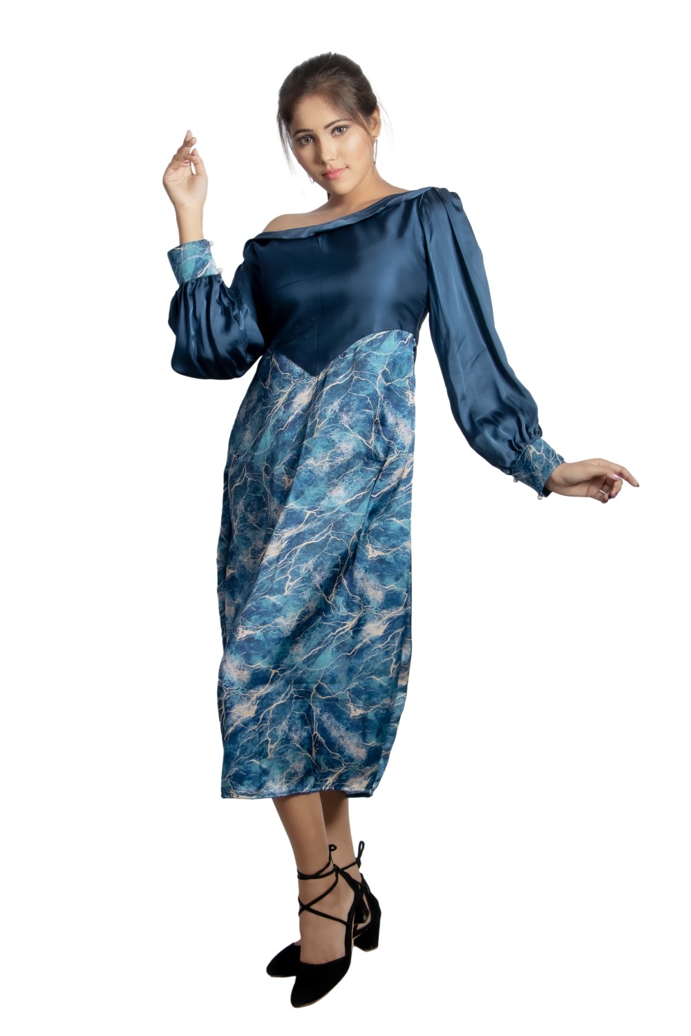 Make your Friday night special with the gorgeous one shoulder puff dress. The subtle shade of midnig...