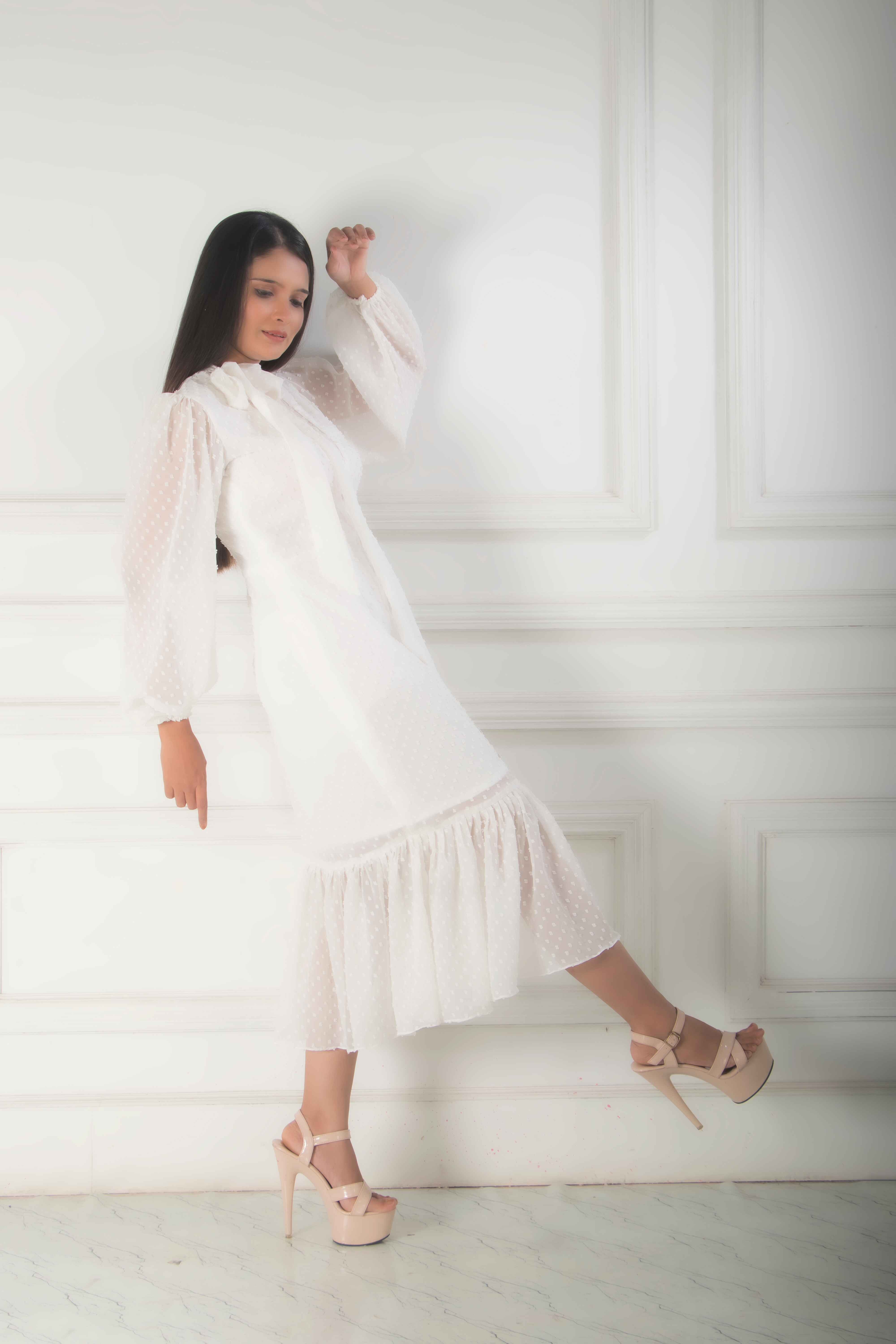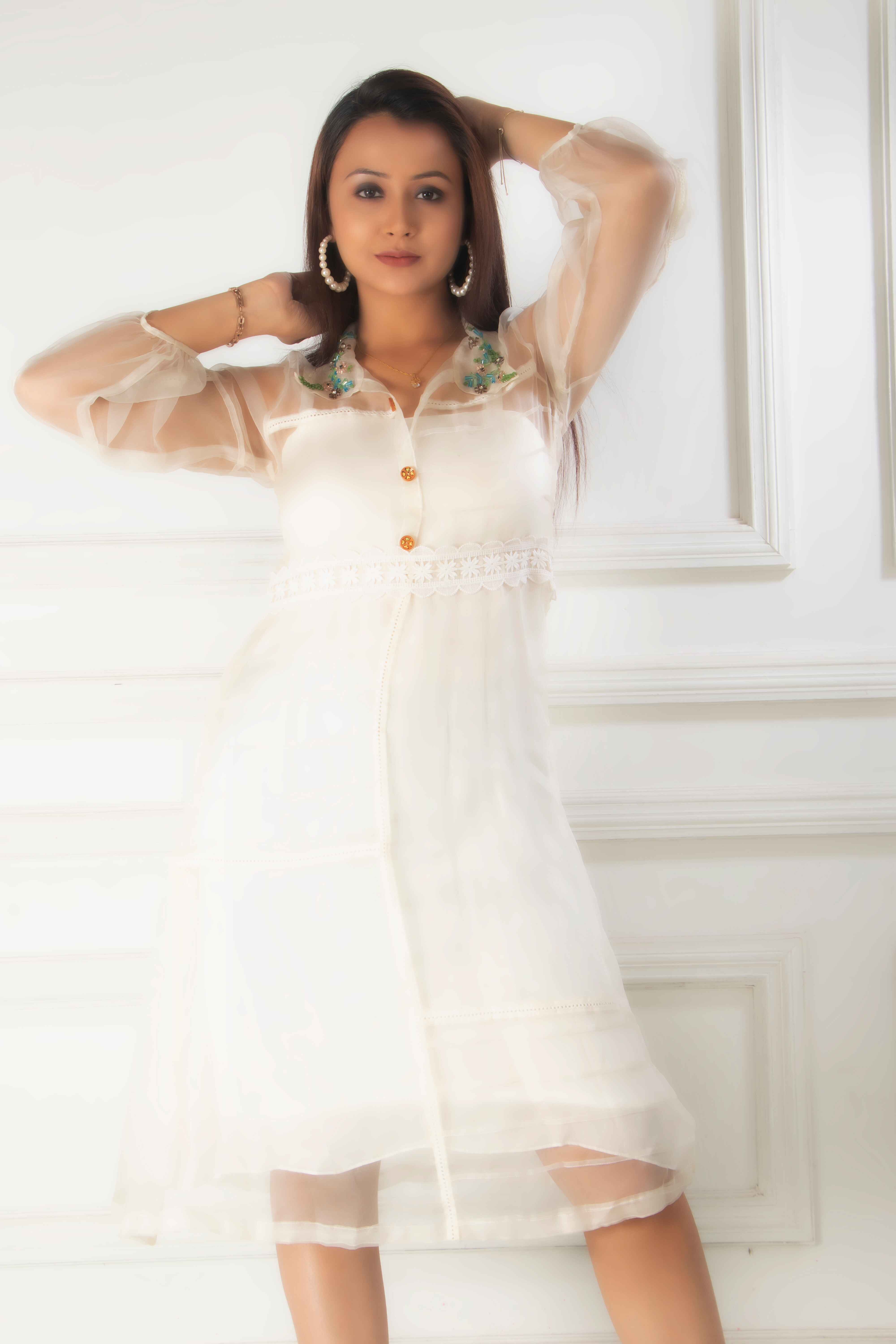Introducing our stunning white dress, crafted from delicate organza fabric. This elegant piece is ad...