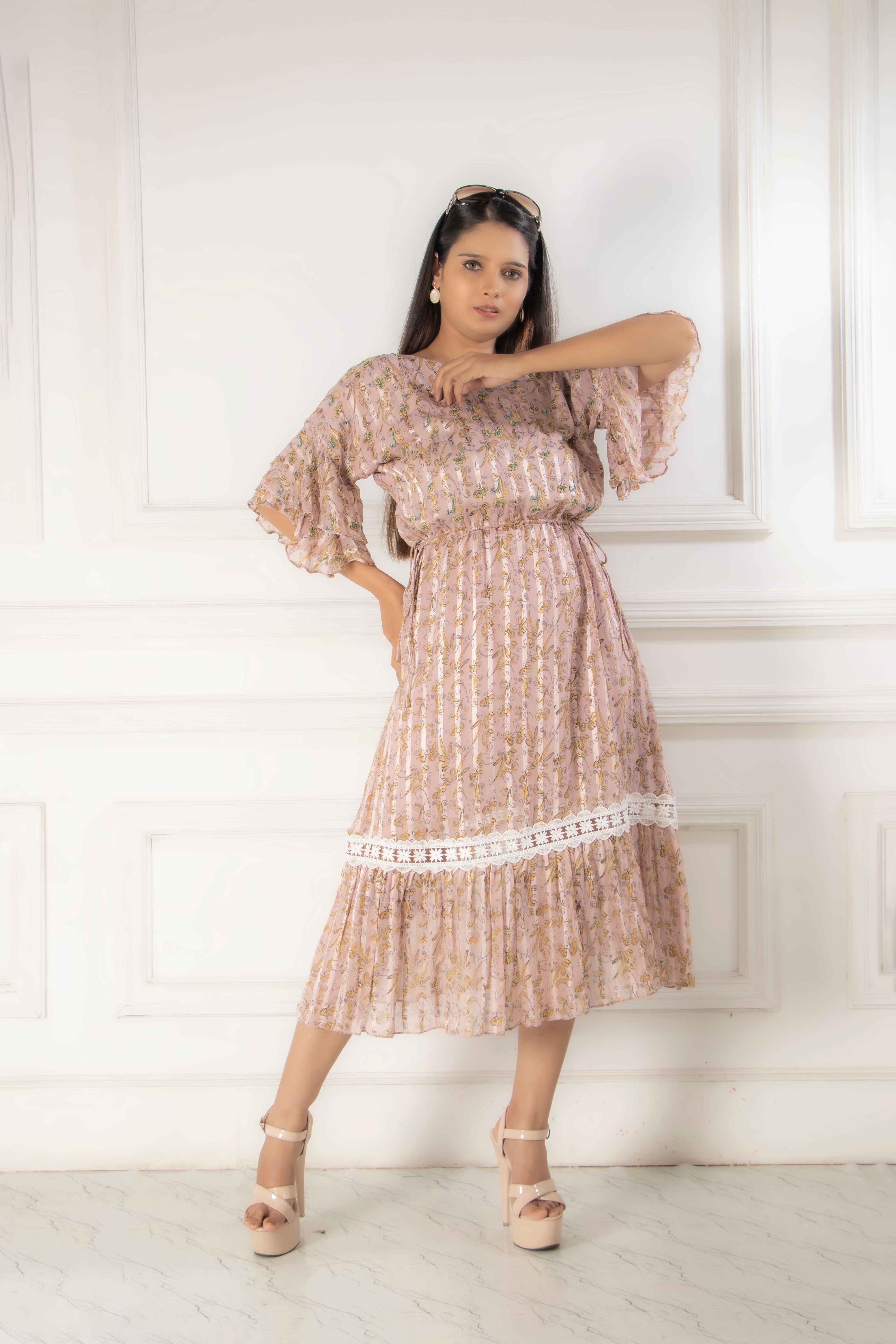 Imbued your evening wear from this piece from Eleanor with the micro-pleated printed georgette dress...