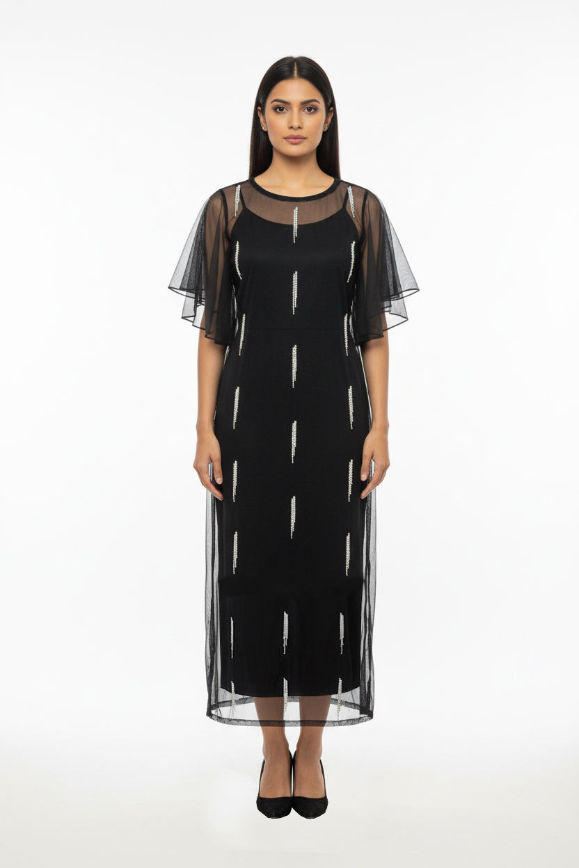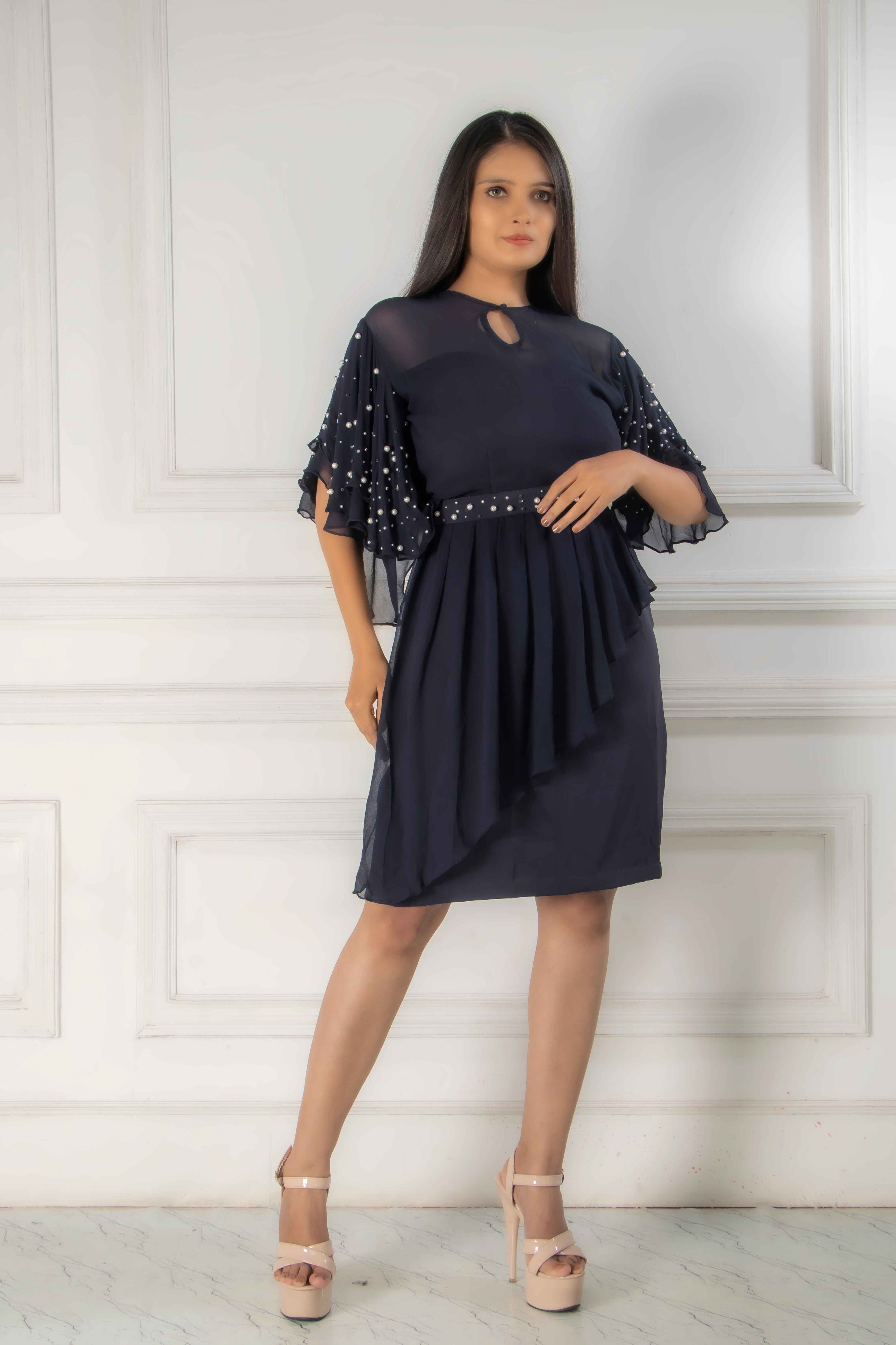 Introducing our stunning midnight dress, designed in a straight-fit silhouette with a chic peplum st...