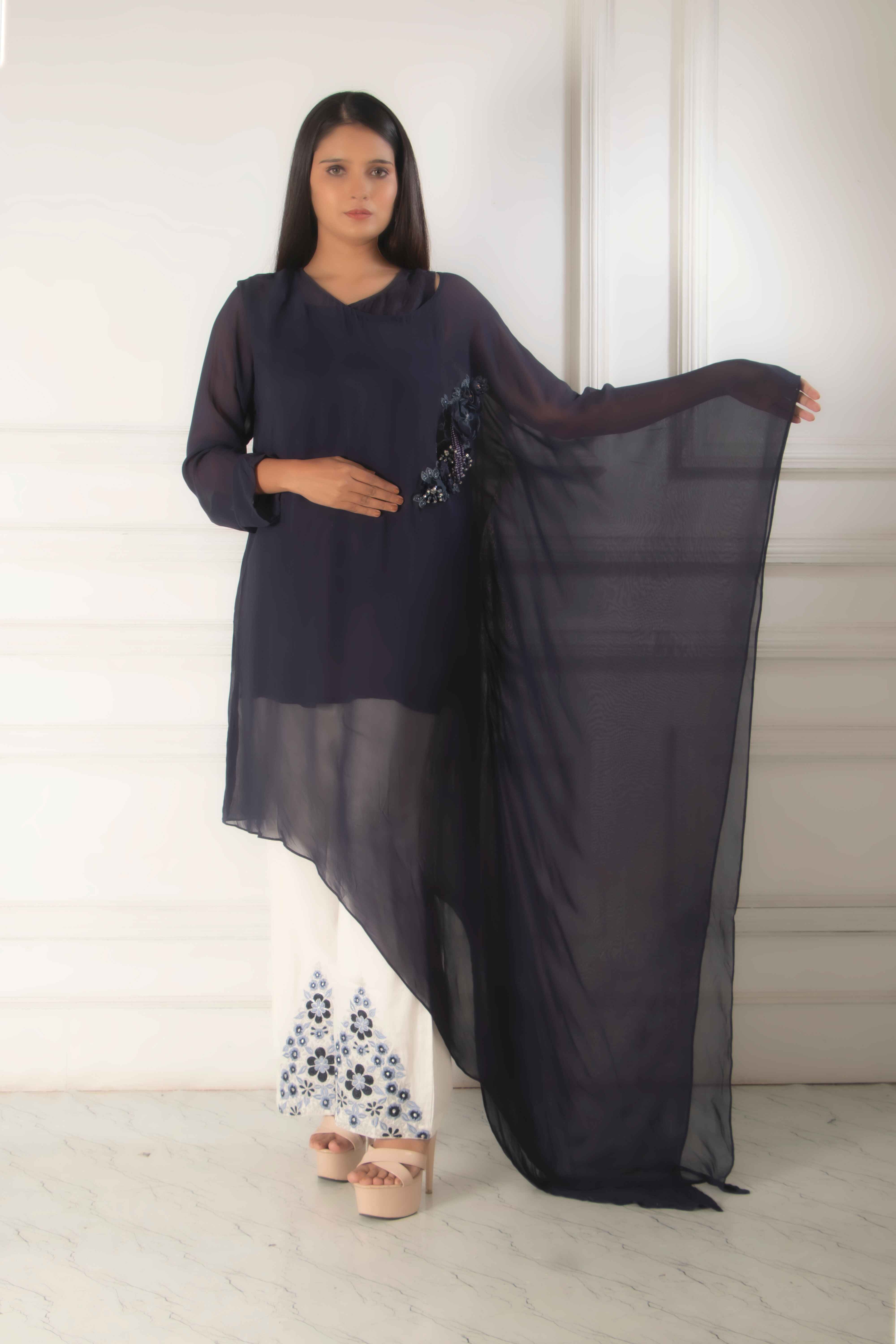 This elegant blouse features navy silk. It is decorated with delicate floral embroidery that adds ti...