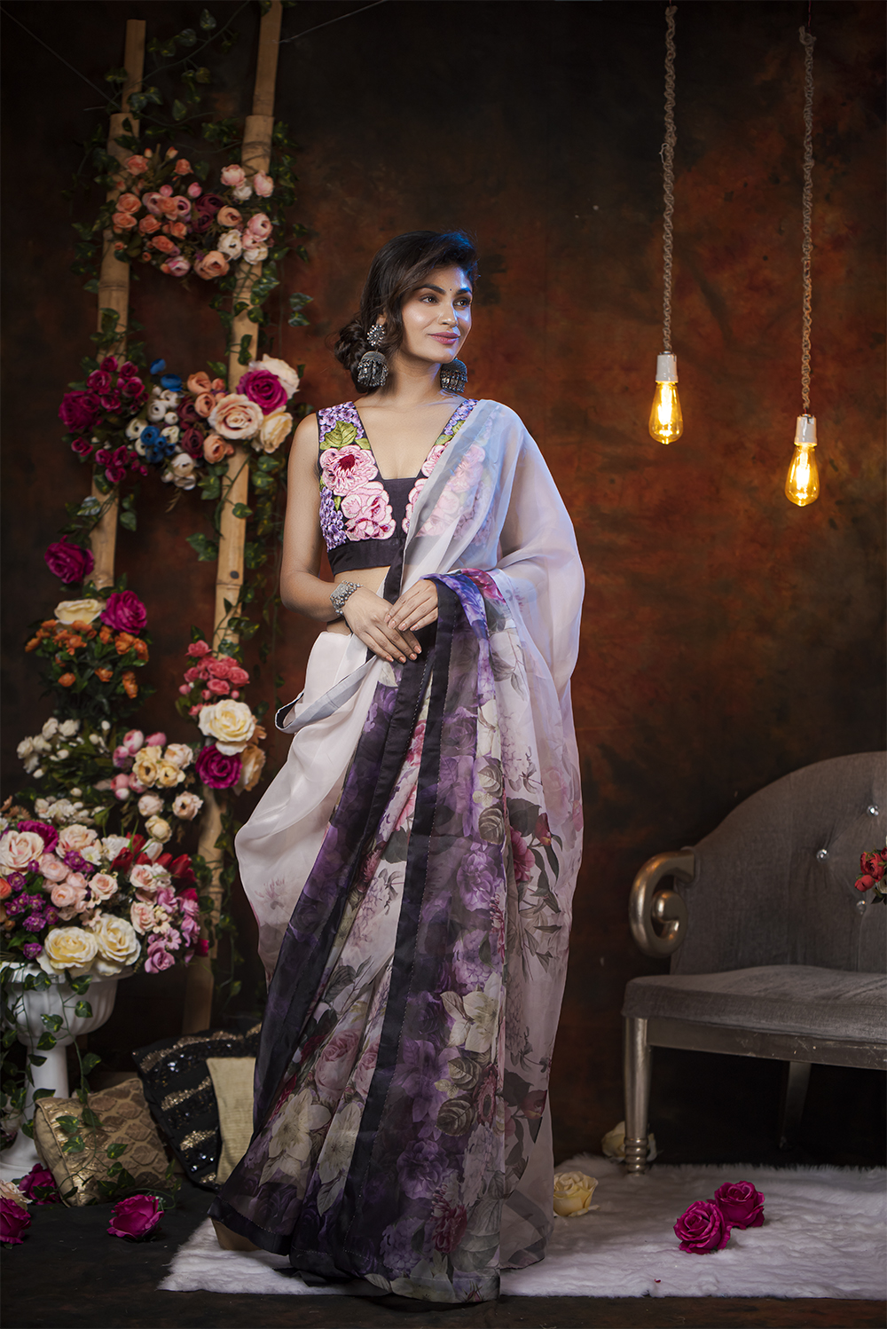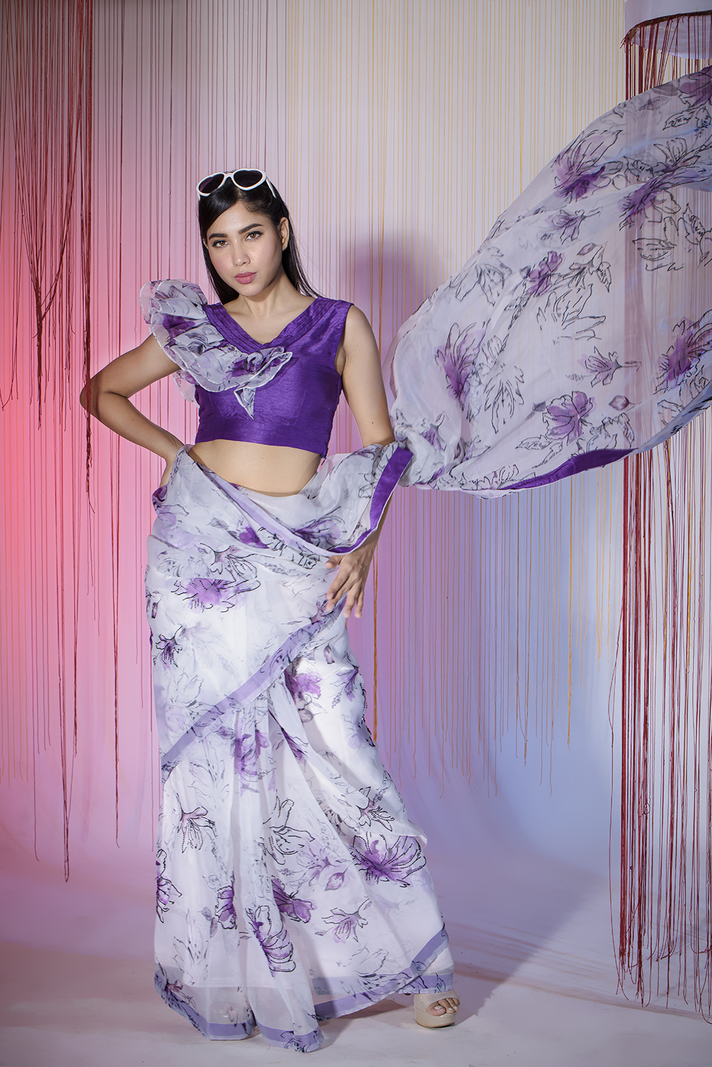 A floral digital print viscose organza saree with highlighting embroidery and one side angle wings f...