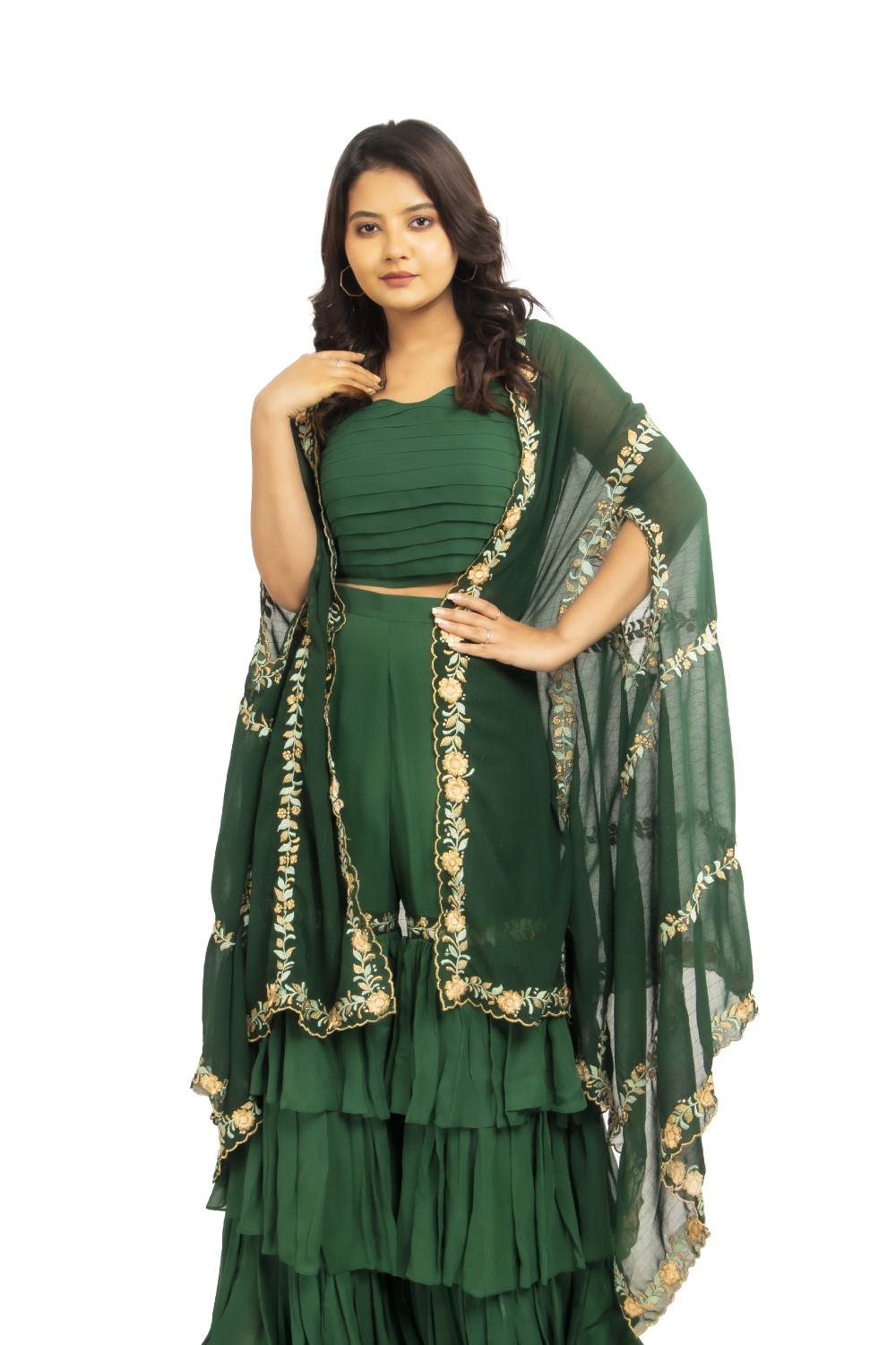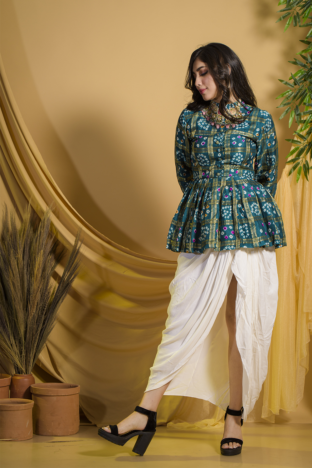 Get ready with this viscose silk emerald green peplum style top designed with white double georgette...