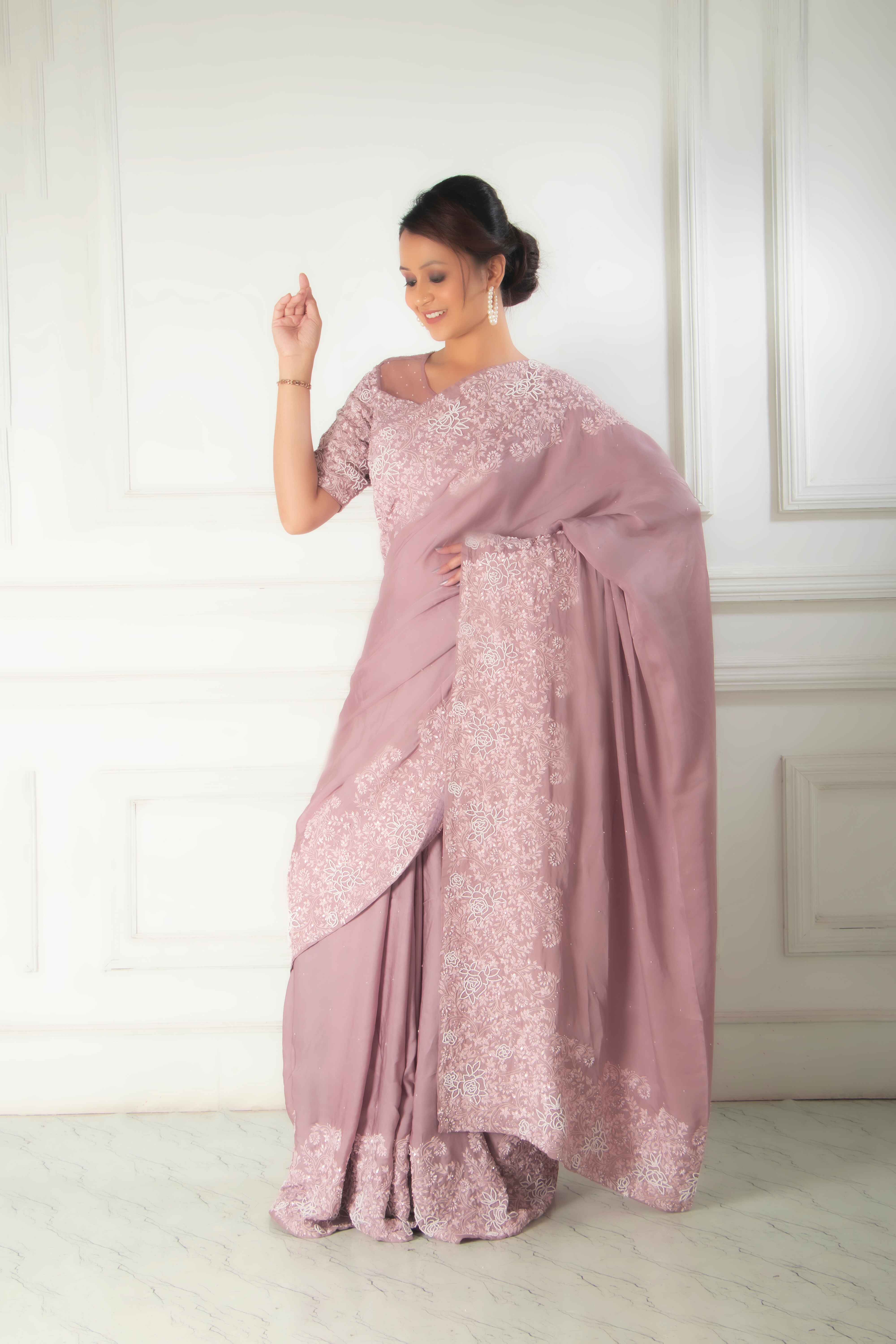 This elegant ensemble features a mauve satin saree. Beautifully decorated with intricate and heavy e...