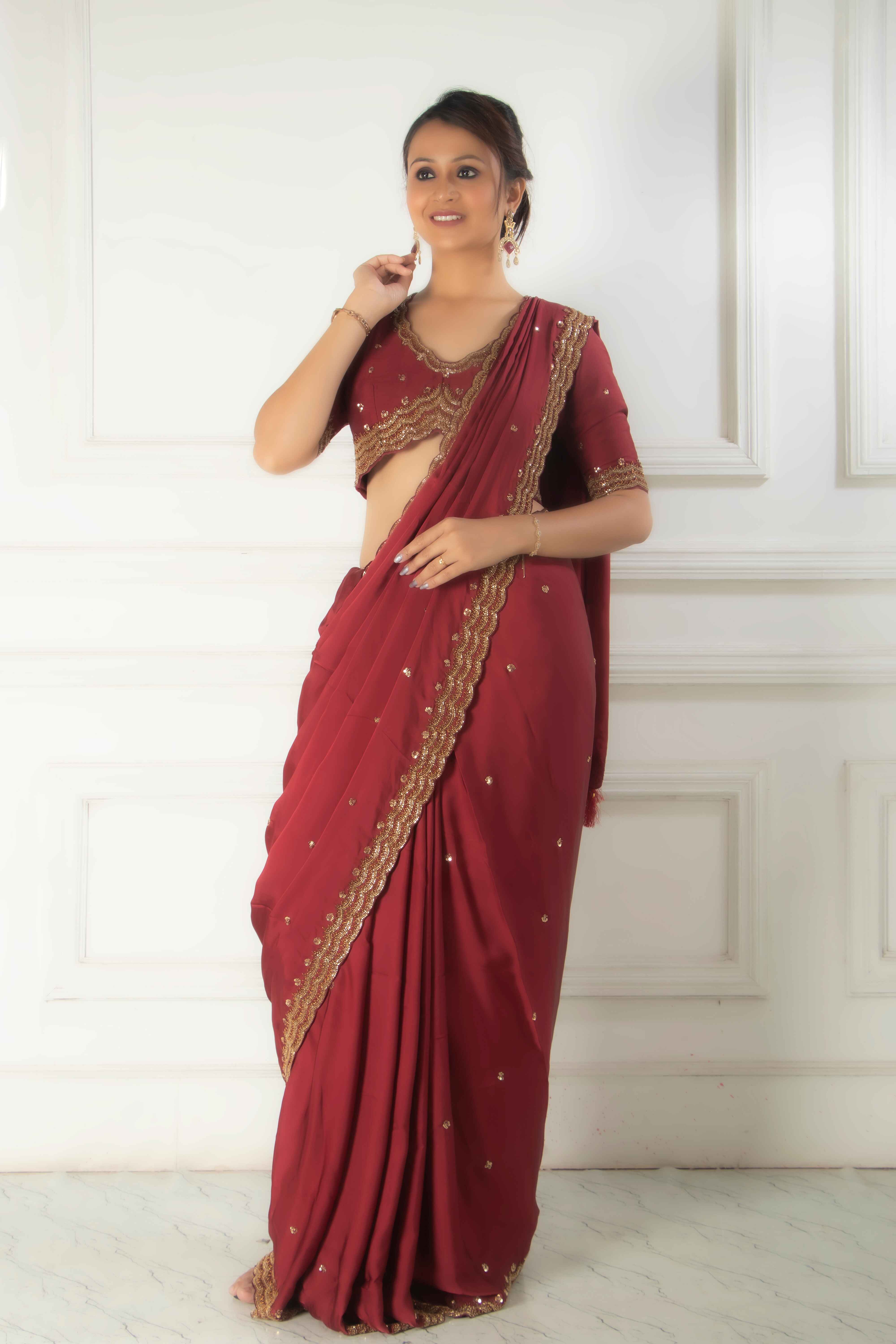 Step into the spotlight with this maroon saree designed to charm with intricate embroidery and rich...