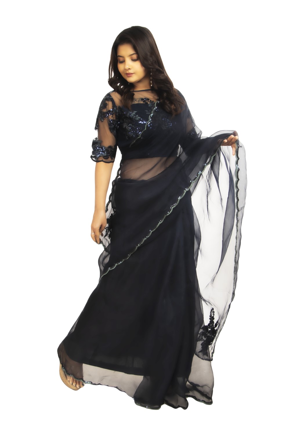 This elegant outfit consists of a solid black organza saree. It is known for its delicate and airy f...