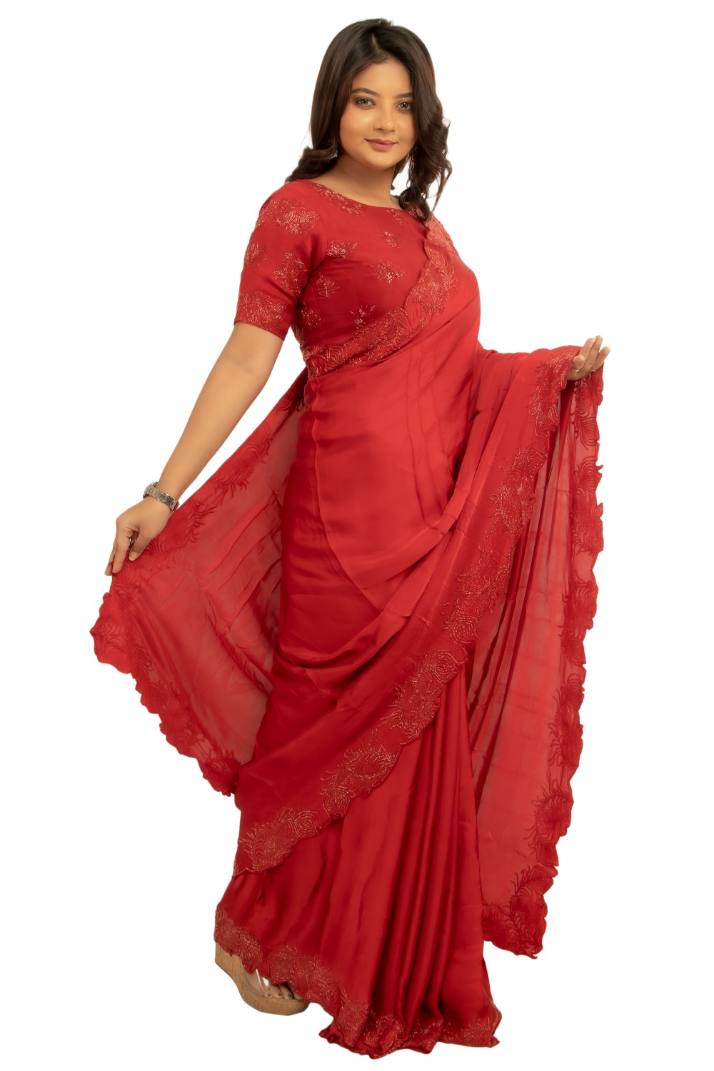 Draped in a rich red hue, this saree features intricate heavy embroidery that celebrates timeless el...