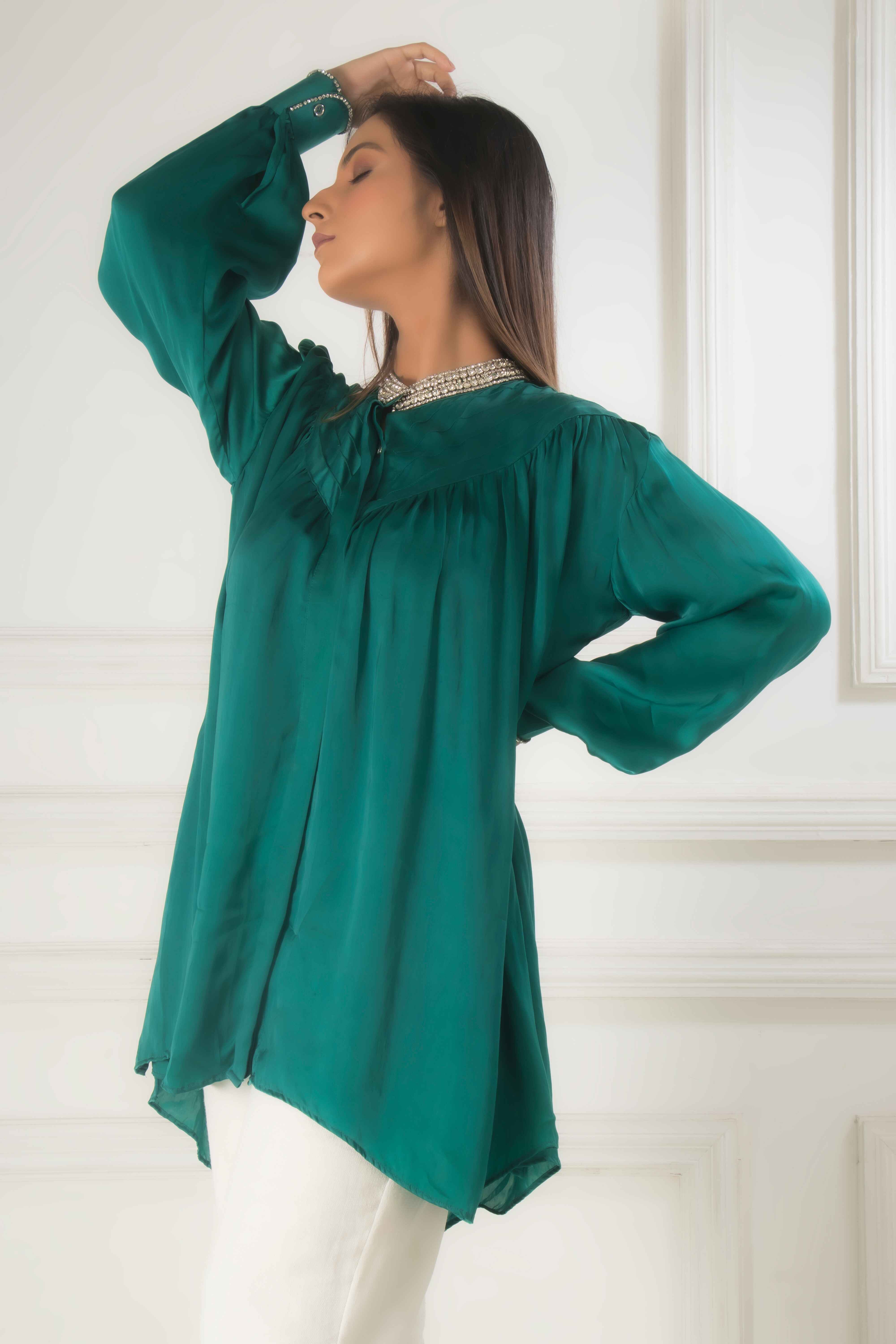 Crafted in lustrous emerald green satin, this pleated shirt brings effortless sophistication to any...