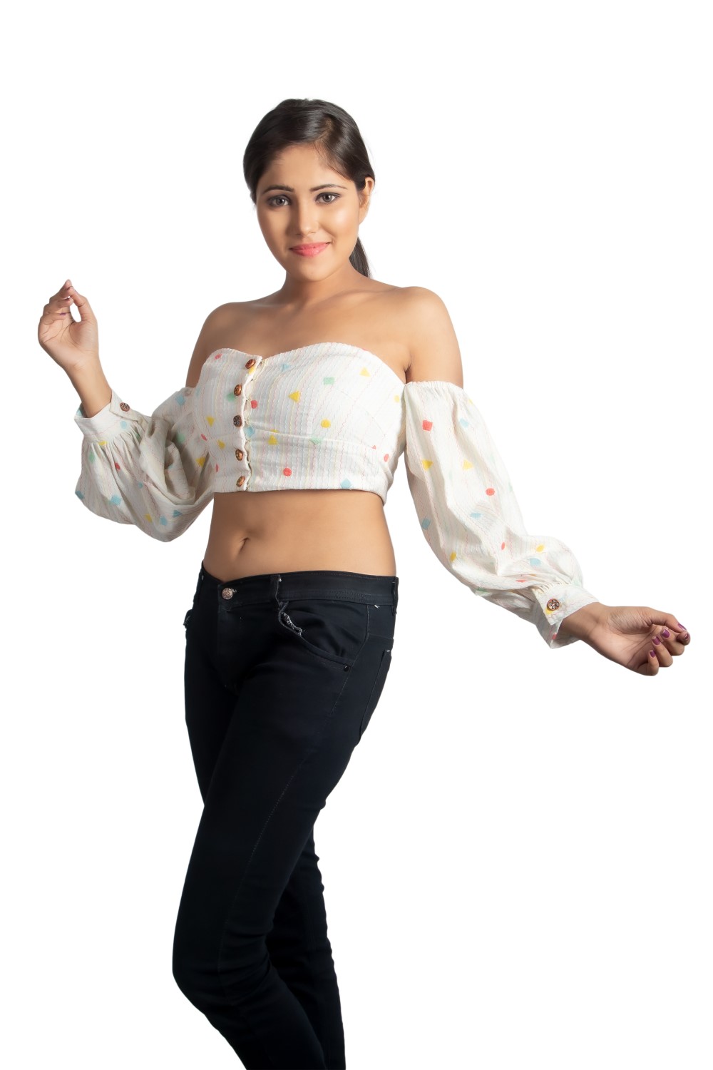 Get that sweet girl attitude more defined with this white and multicolor thread work crop top.