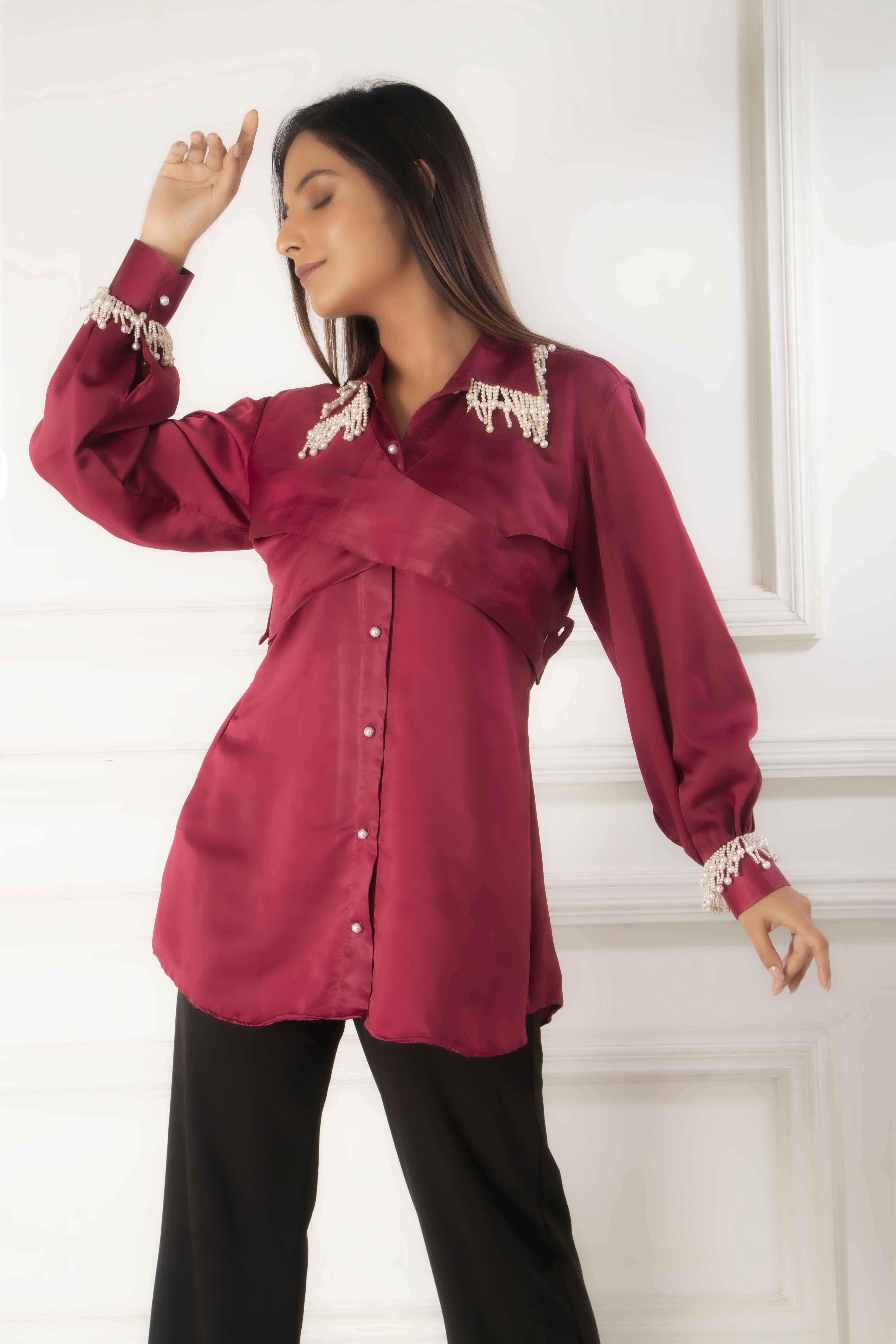 Elevate your style with our Wine Regular Fit shirt, adorned with delicate pearls on the collar and s...