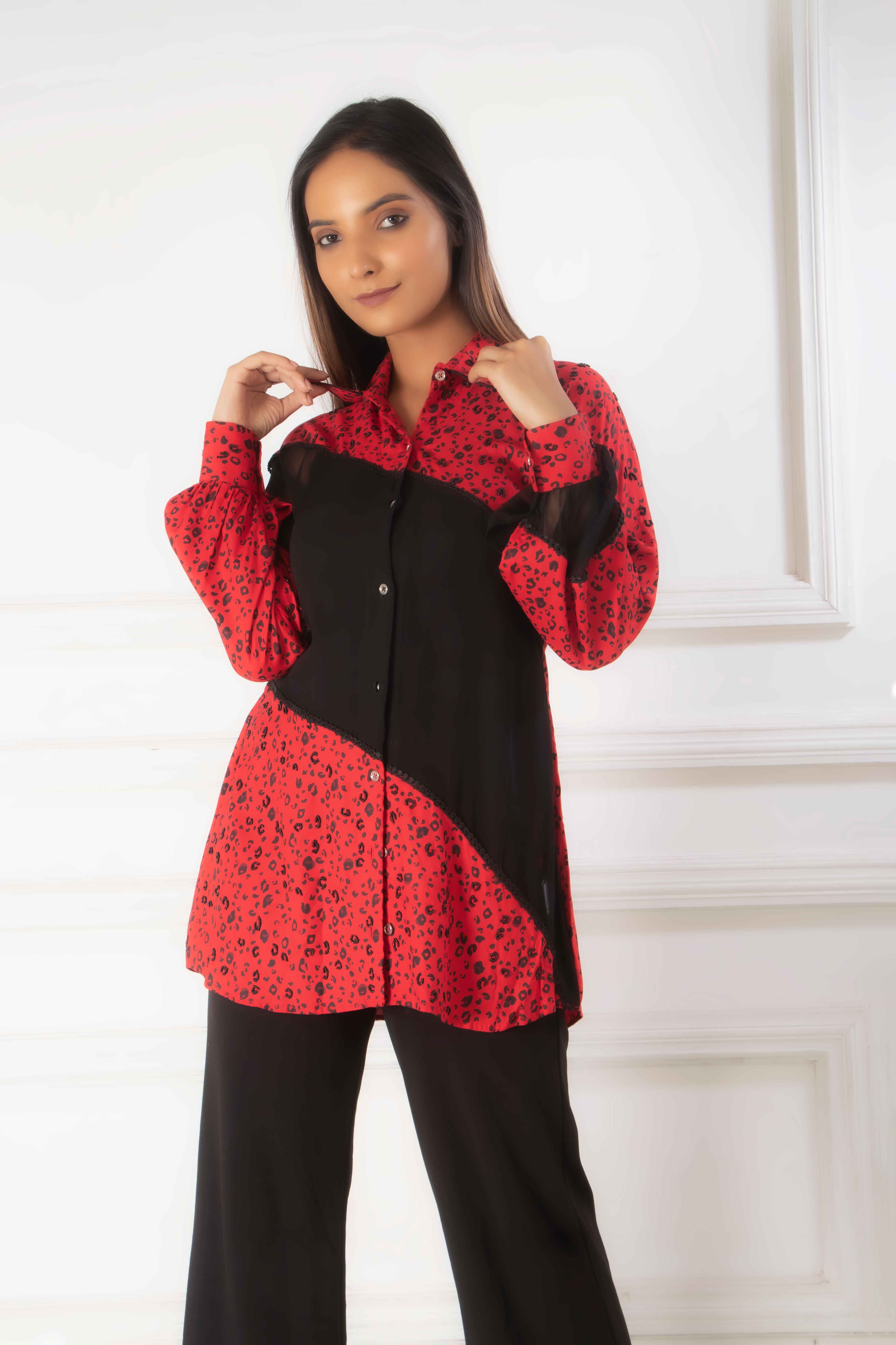 Add a bold touch to your wardrobe with our red and black shirt, enhanced with elegant embellishments...