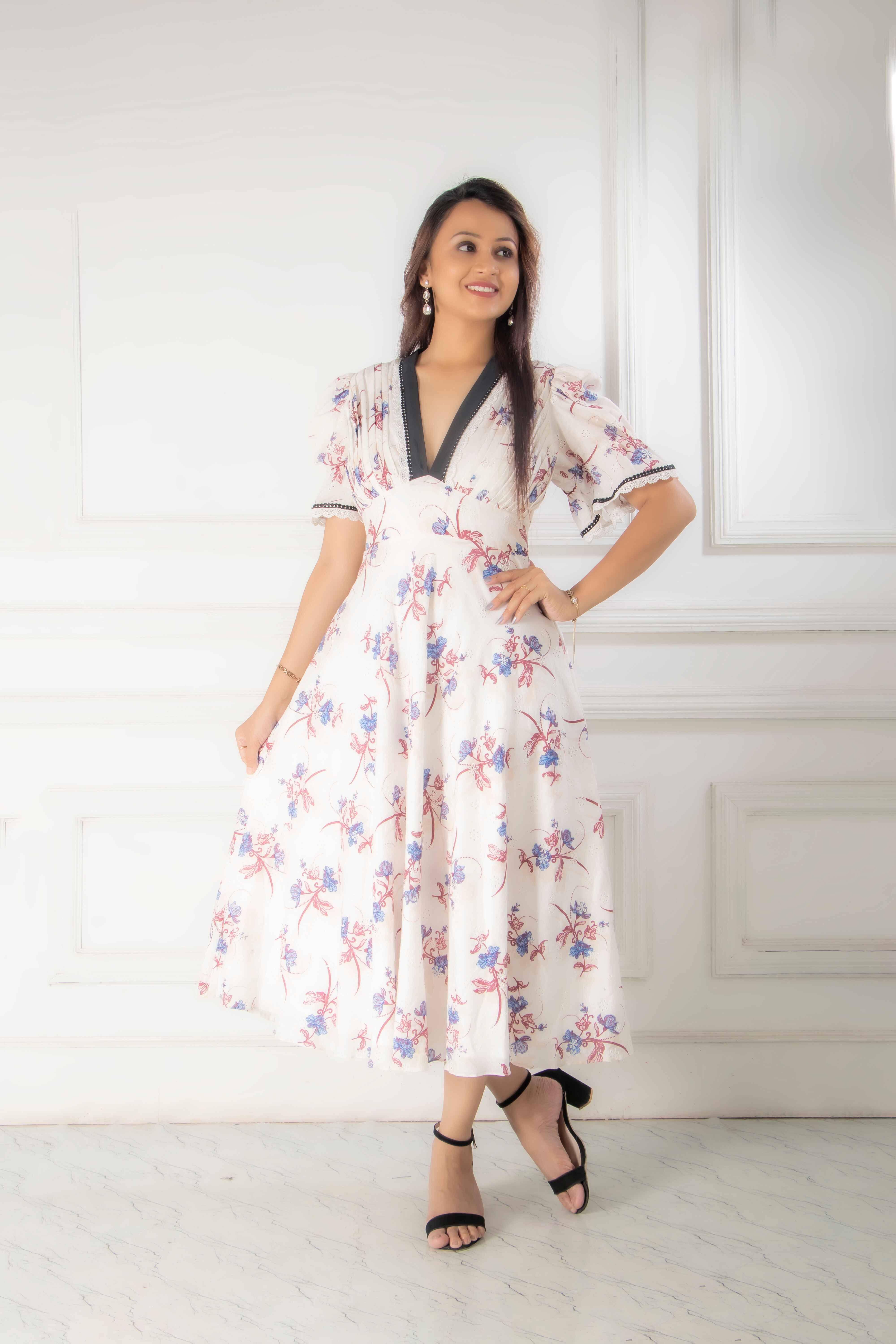 Elevate your wardrobe with our stunning white cotton dress, featuring a flattering fit & flare silho...