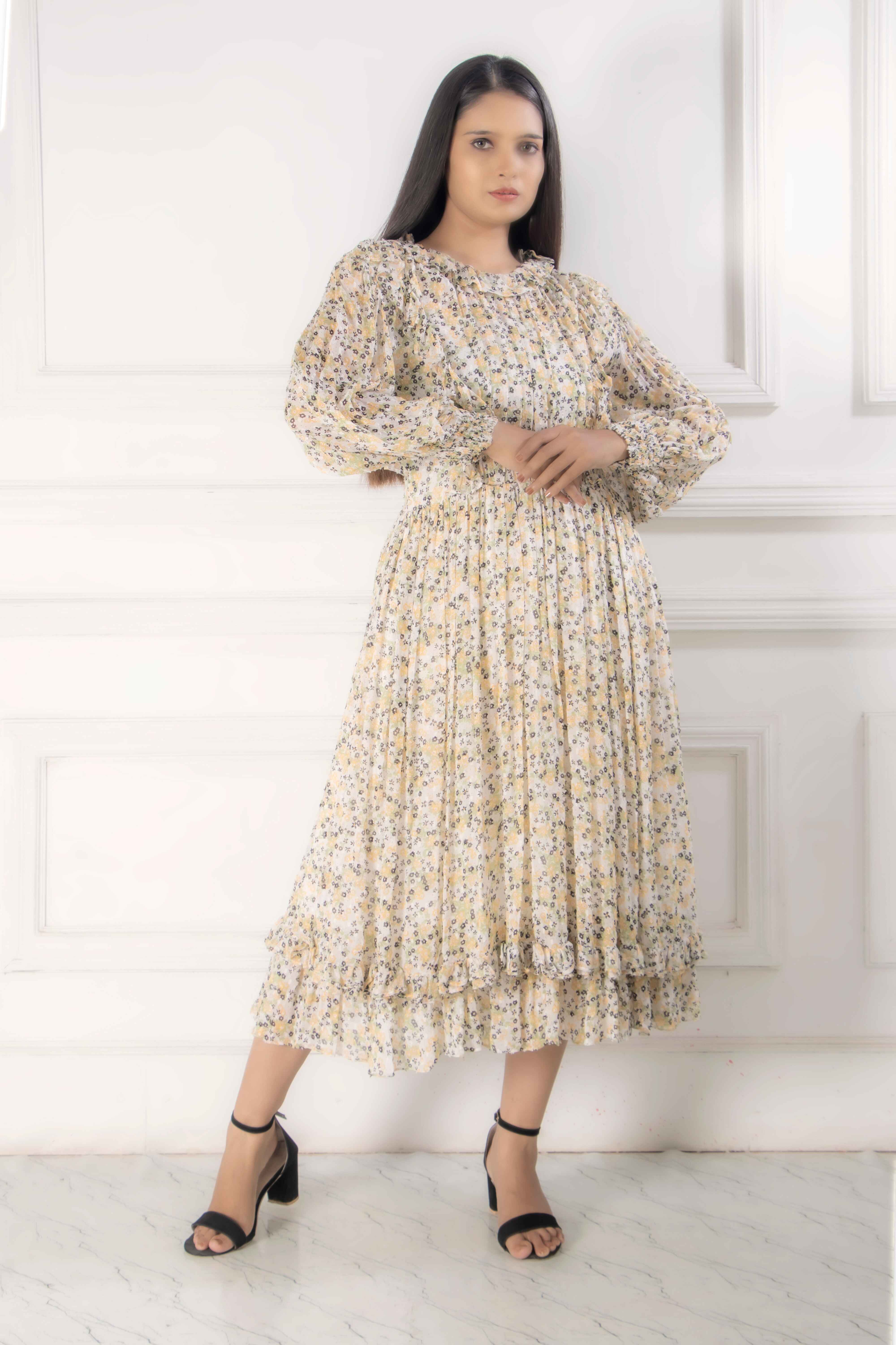 Imbued your evening wear from this piece from Eleanor with the micro-pleated printed georgette dress...