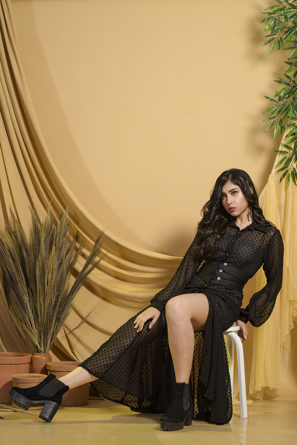 Black clip booti poly georgette maxi length sheer dress with bishop sleeves and monochromatic slip....