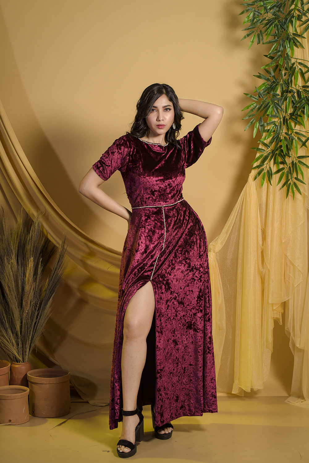 Look flattering and ultra-chic with this wines colour velvet gown from Zariah. The gown flaunts your...