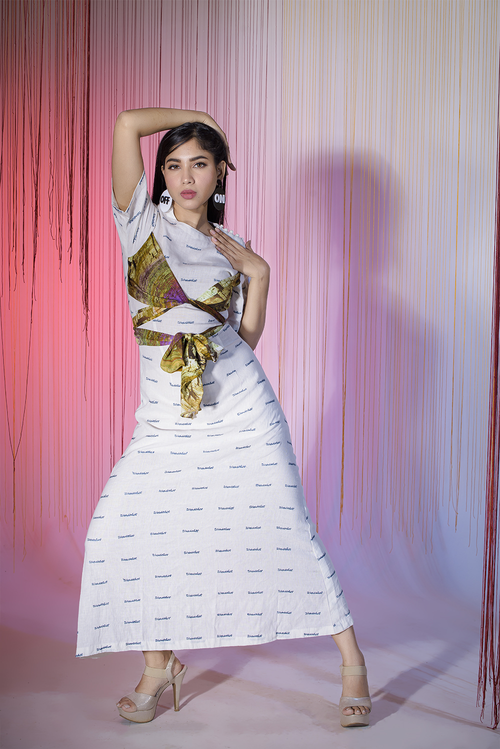 An off-white linen dress with multi print satin tie-up. The “wanderlust" embroidery on the dress mak...