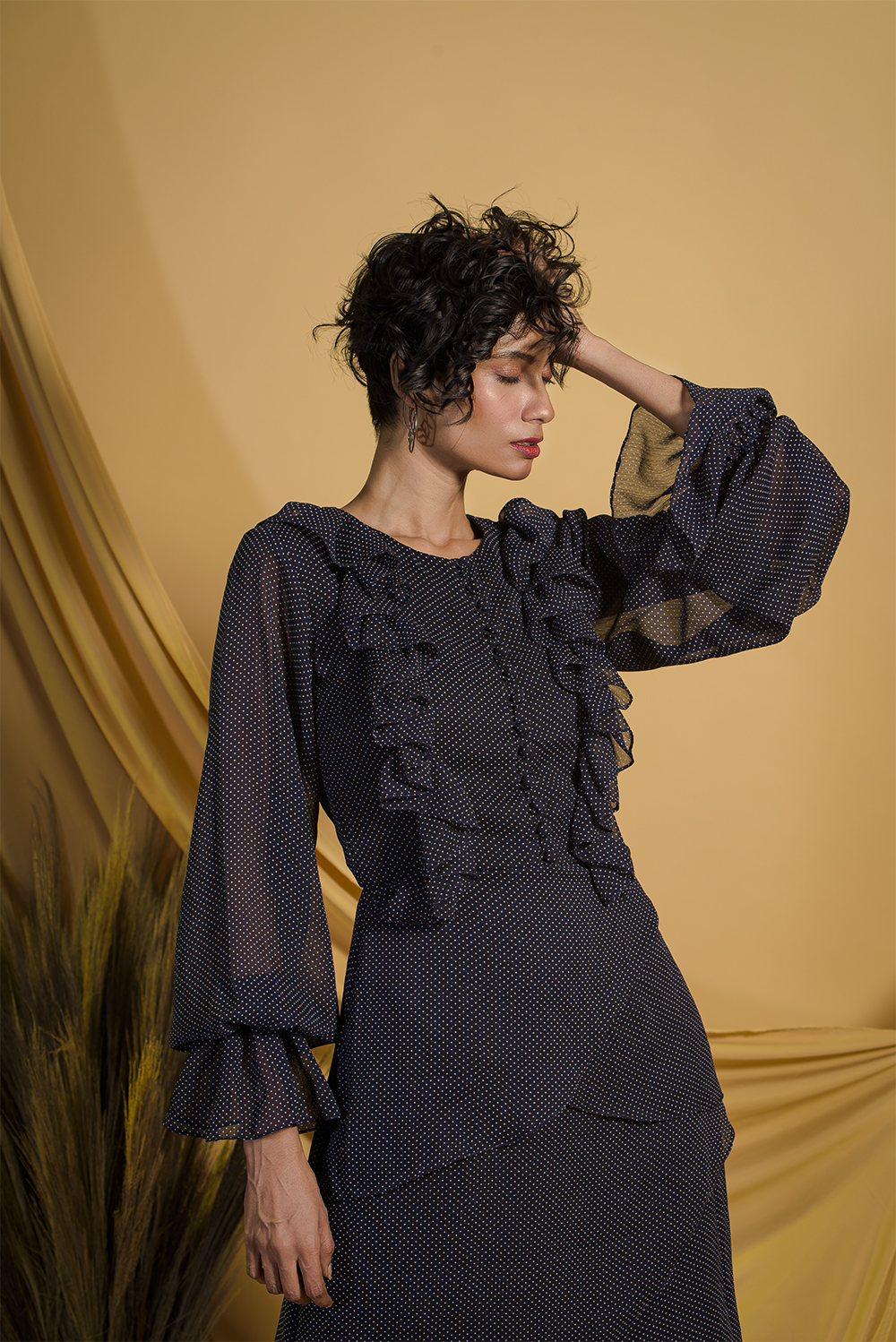 White poly flat chiffon shirt dress with minute polka dots. The frills on the yoke and at the bottom...