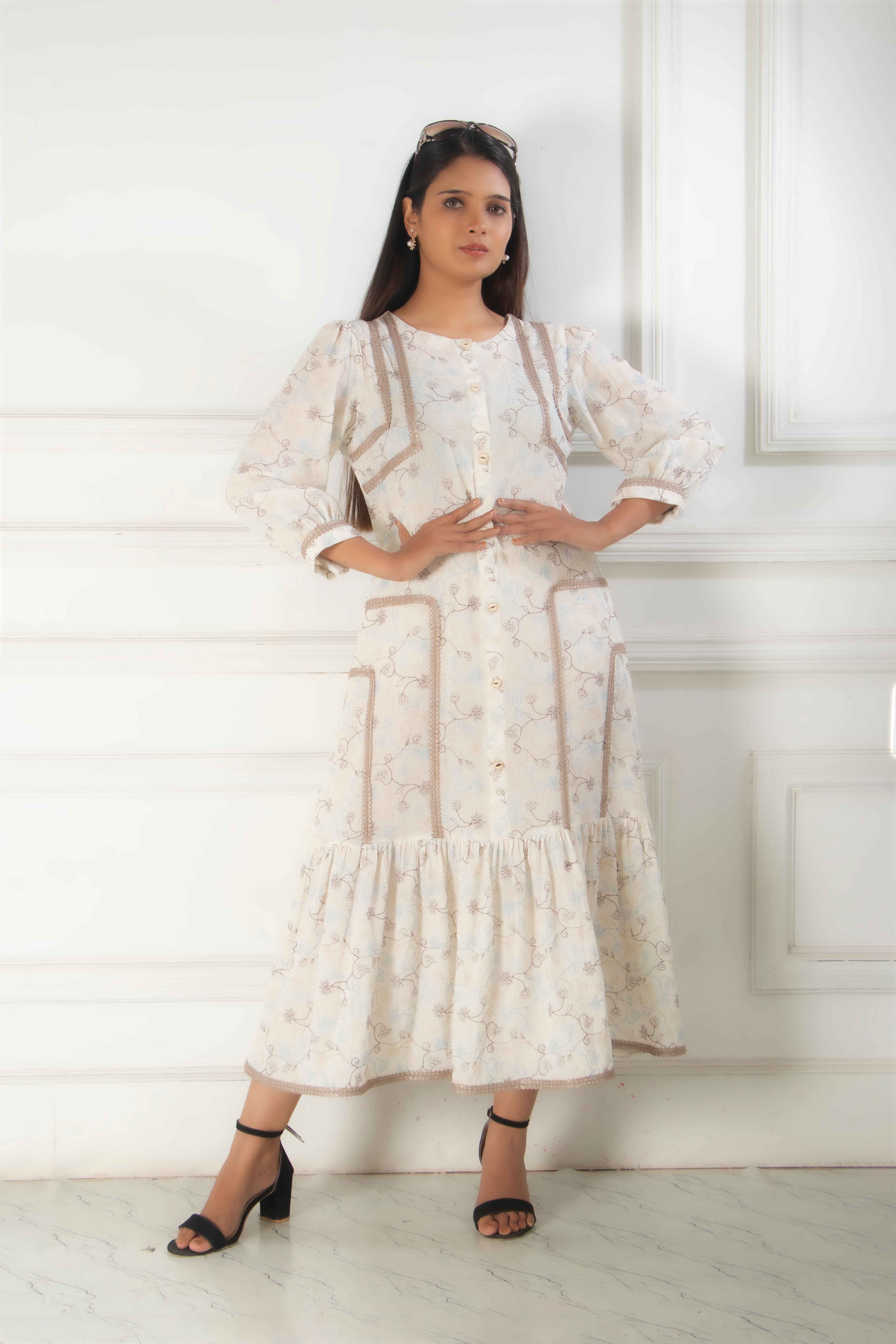 Introducing our elegant off-white long dress, crafted from soft and breathable cotton for all-day co...