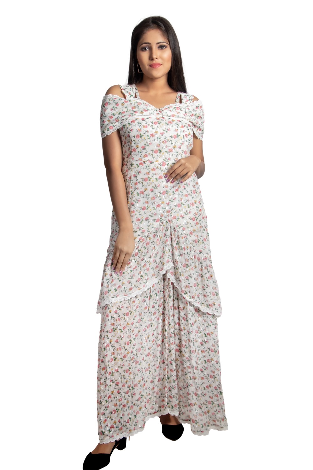 Get a refreshing look this summer with the minute polka dot in poly georgette. This ruffled layer dr...