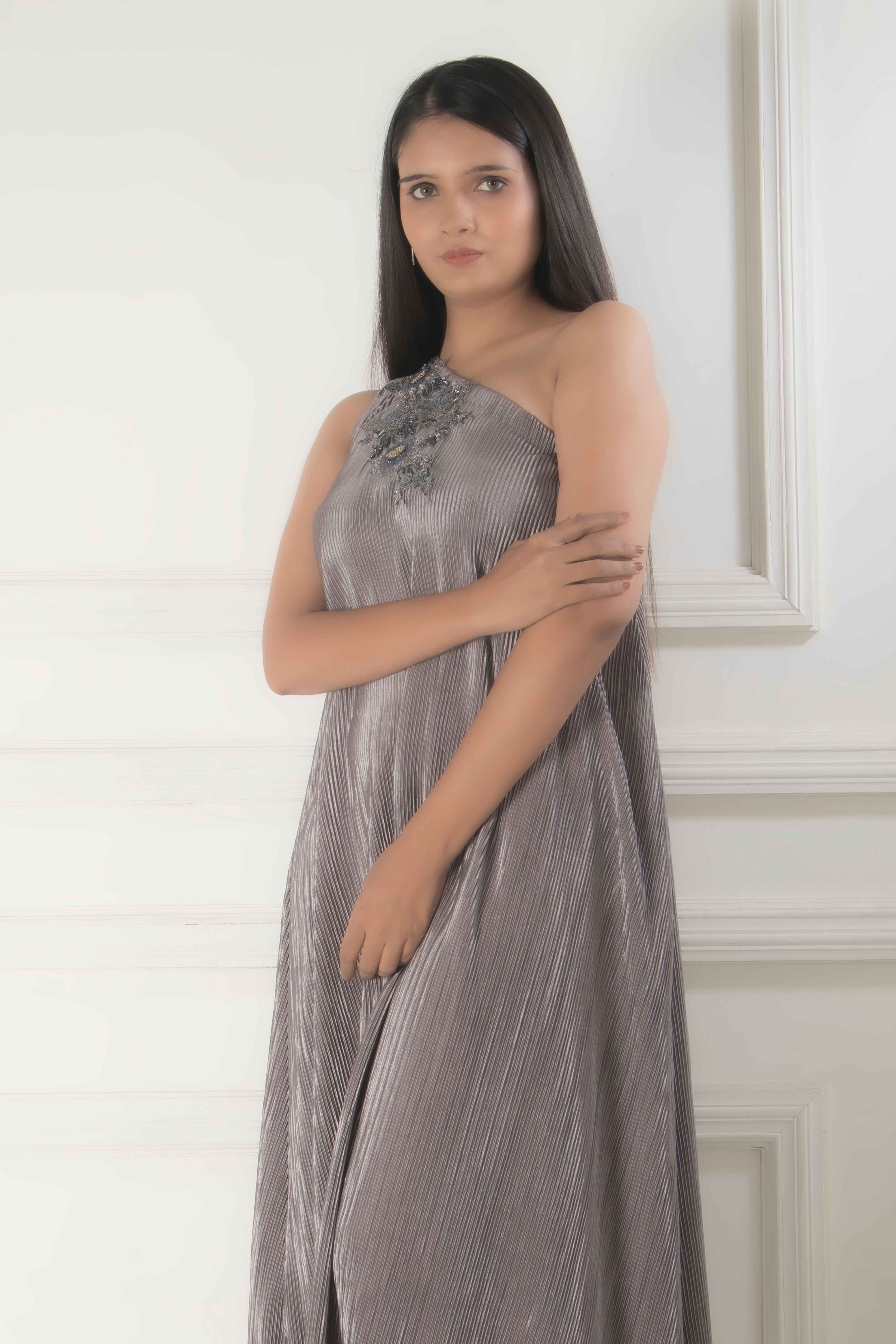 Add panache to your party wear with this stylish one-piece gown from Eleanor. The metallic pleats on...