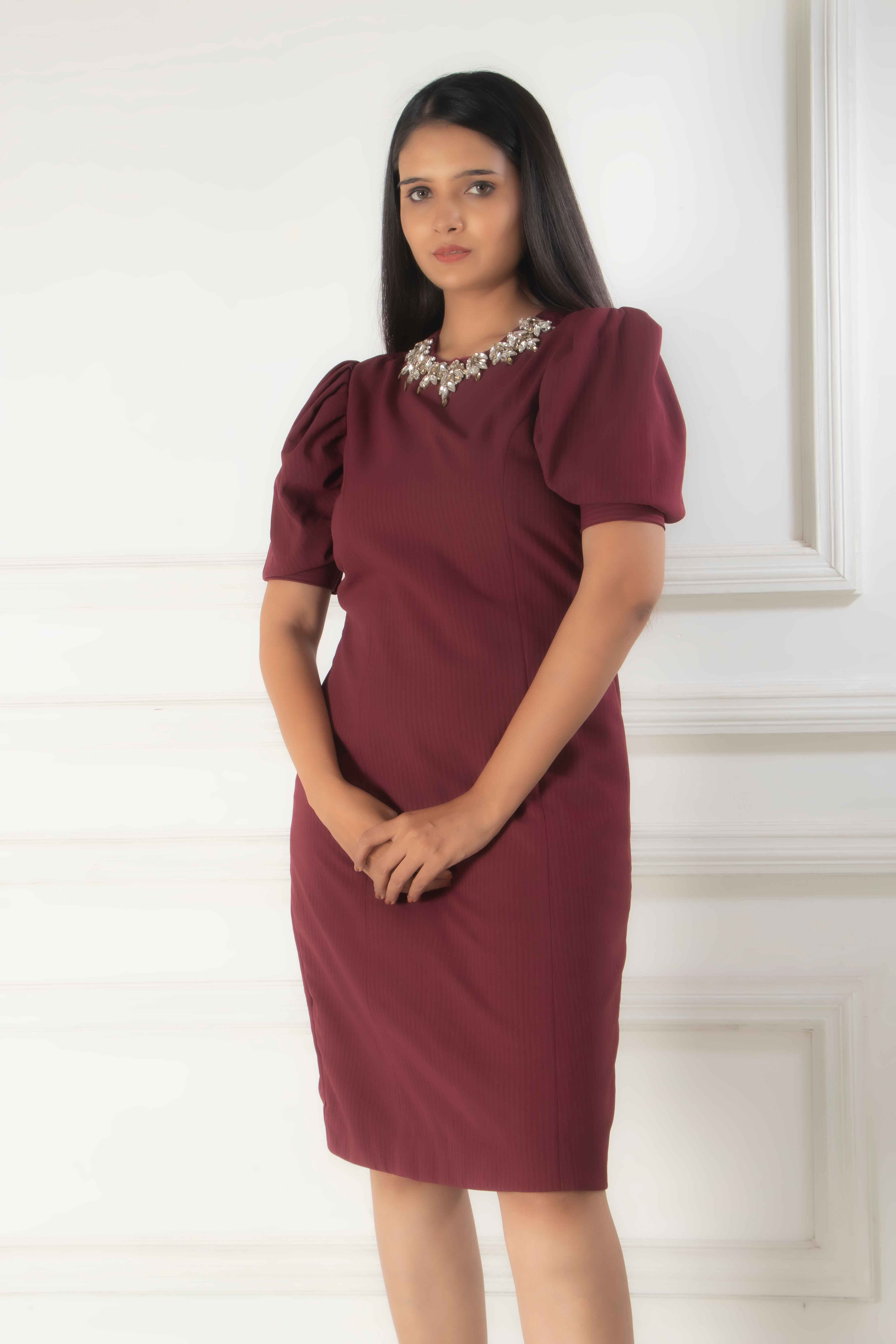 Introducing our Classic Maroon Dress, designed in a body fit silhouette that accentuates your figure...
