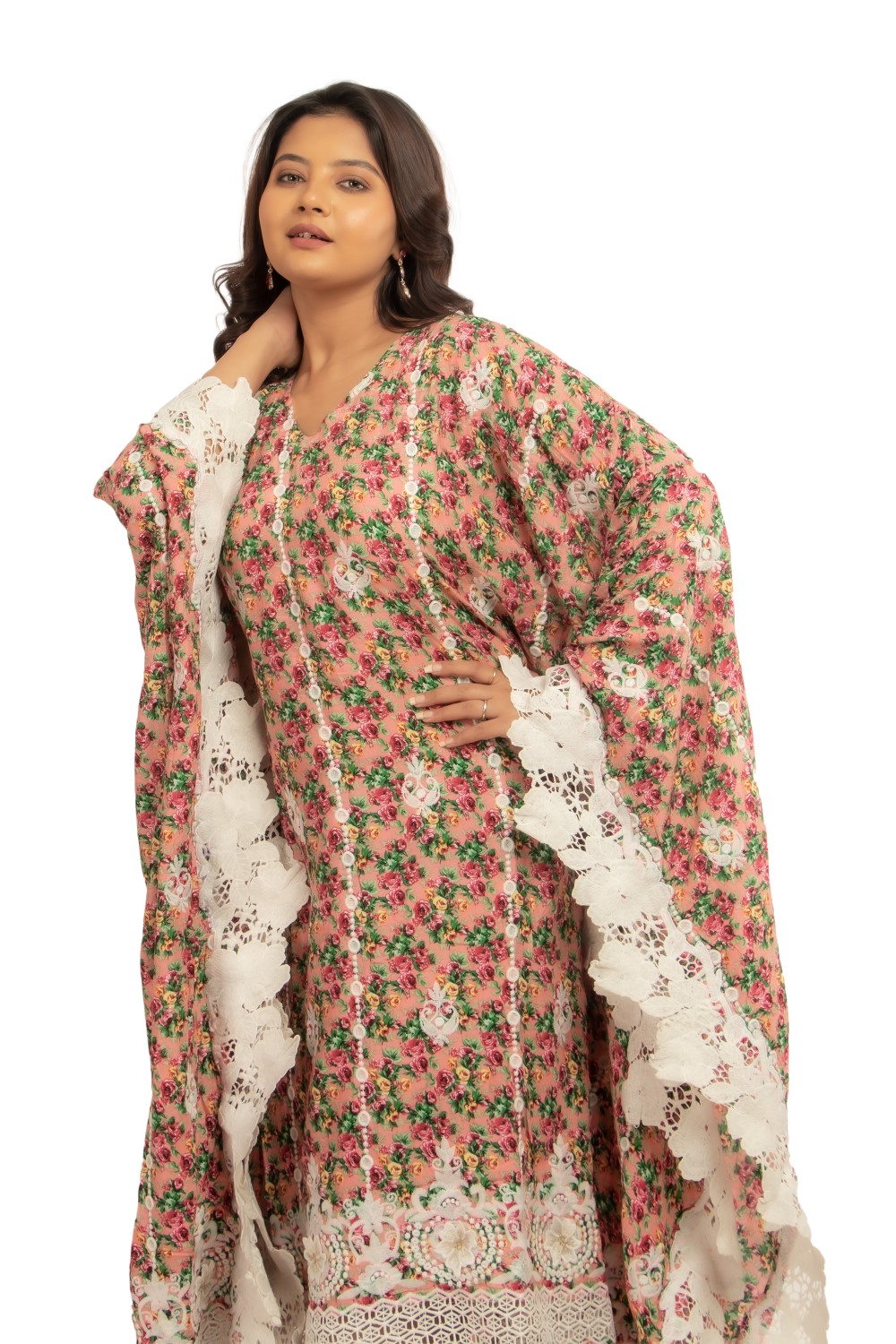 A box pattern floral print cotton kaftan. The simple cotton laces at he edge are an addons for your...