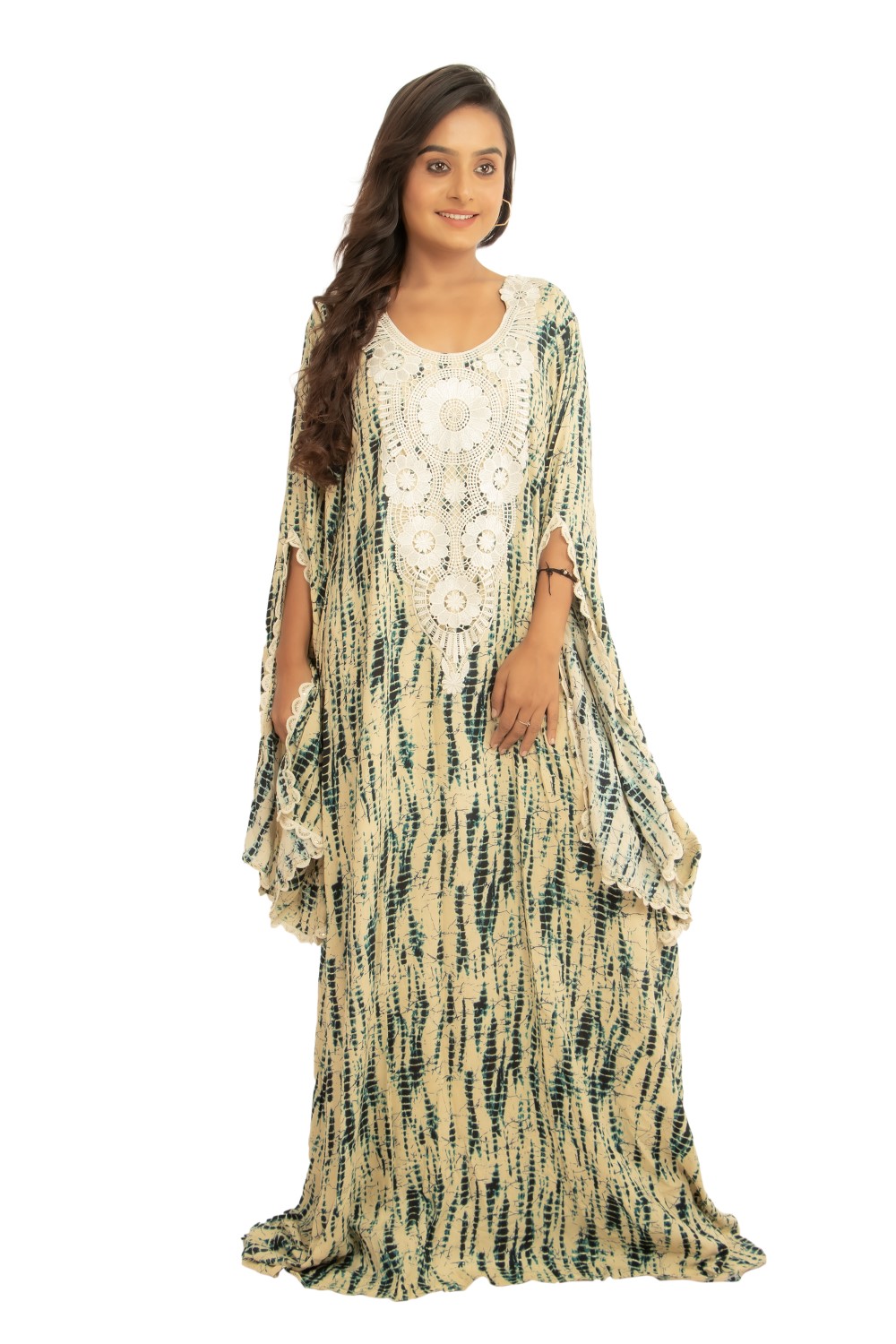 Bring this imbueded, eminent tie & dye print kaftan with applique at neck from Zariah.