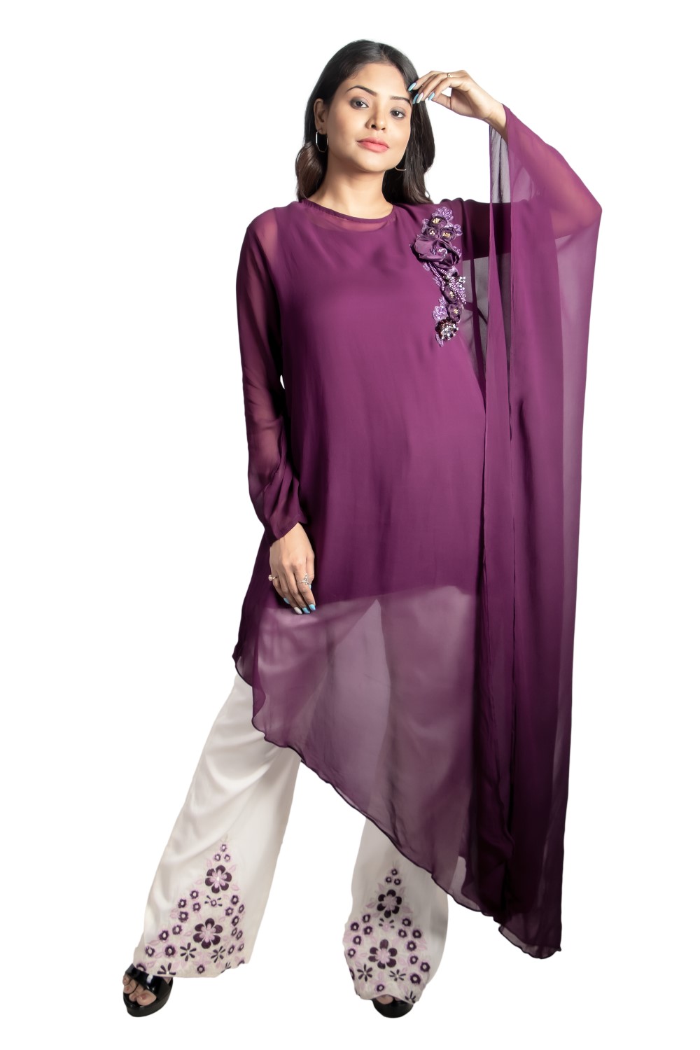 A floral digital print viscose organza saree with highlighting embroidery and one side angle wings f...
