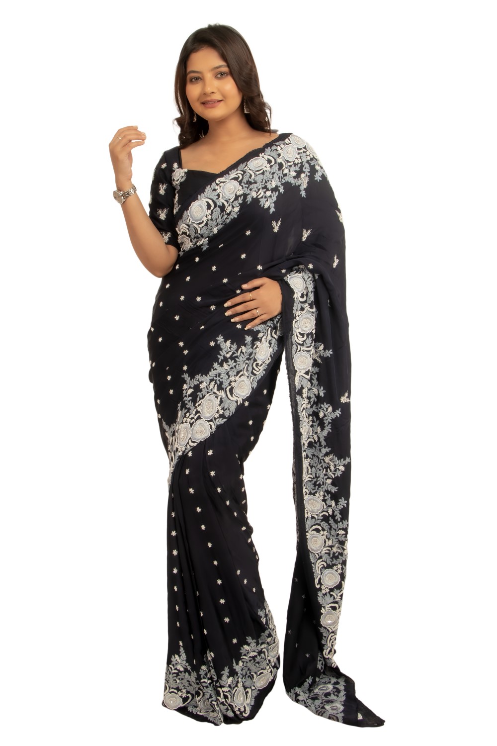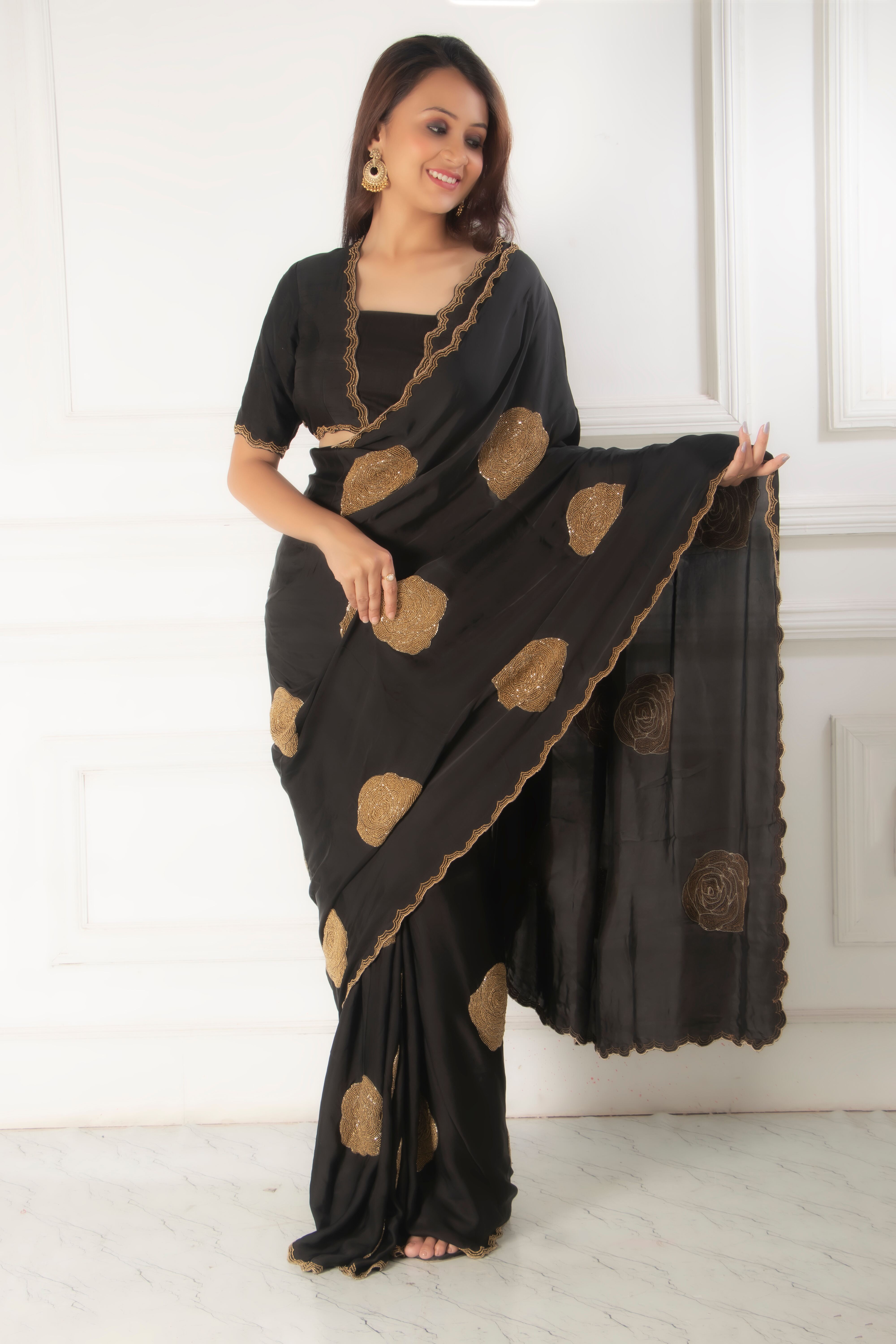 This opulent set features a striking black satin saree, adorned with intricate heavy rose embroidery...