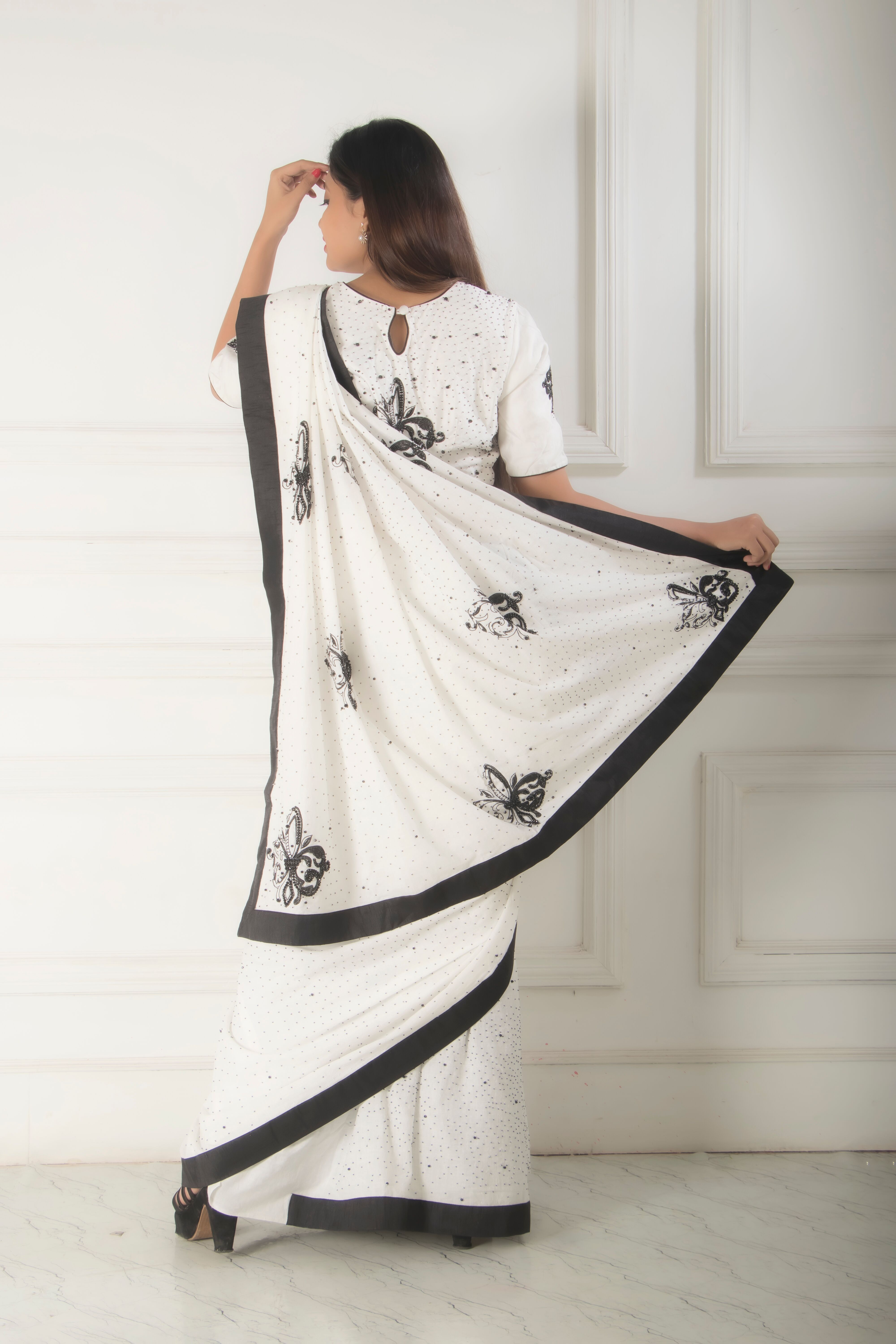This exquisite set features a white handloom saree, adorned with striking black bead embroidery that...