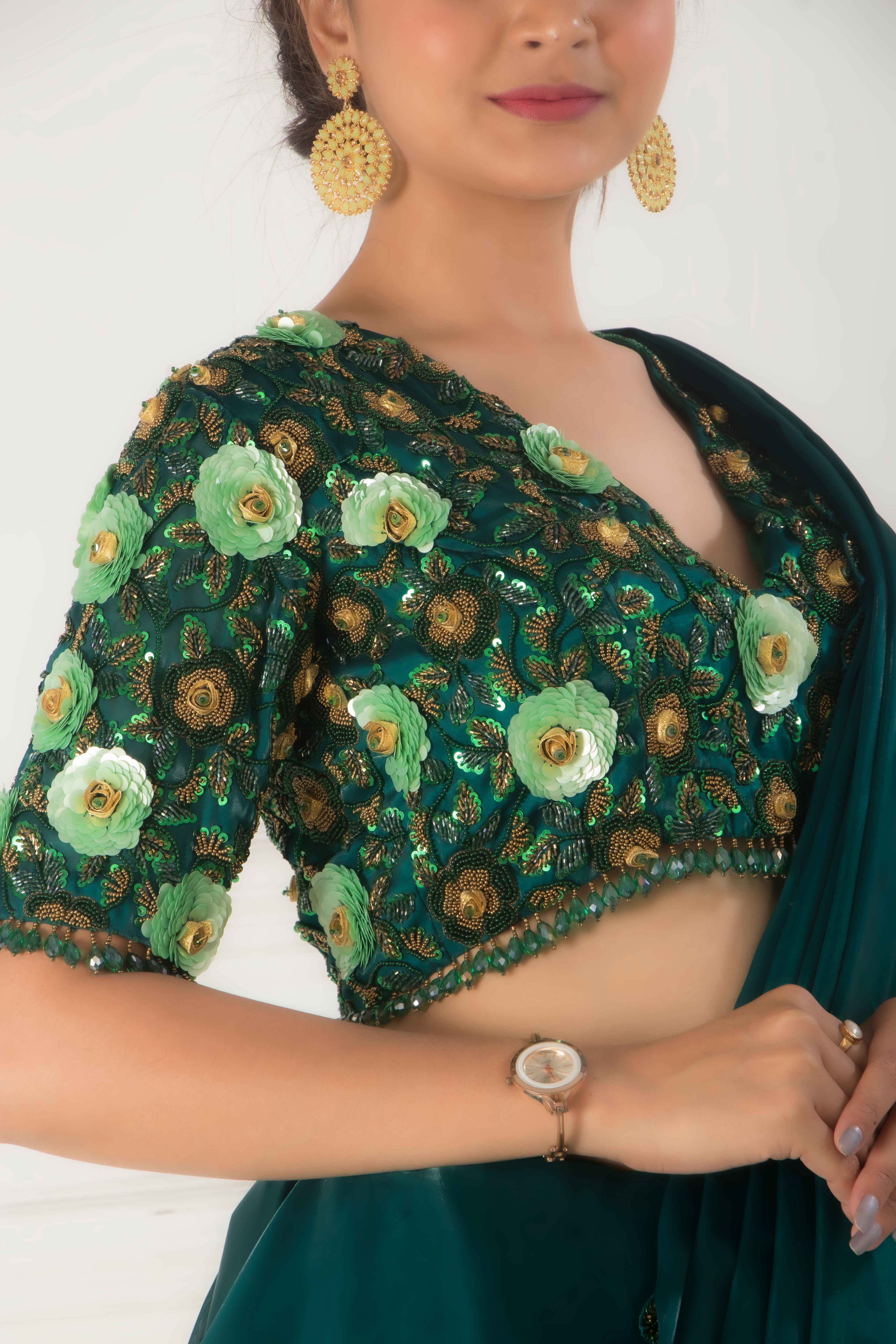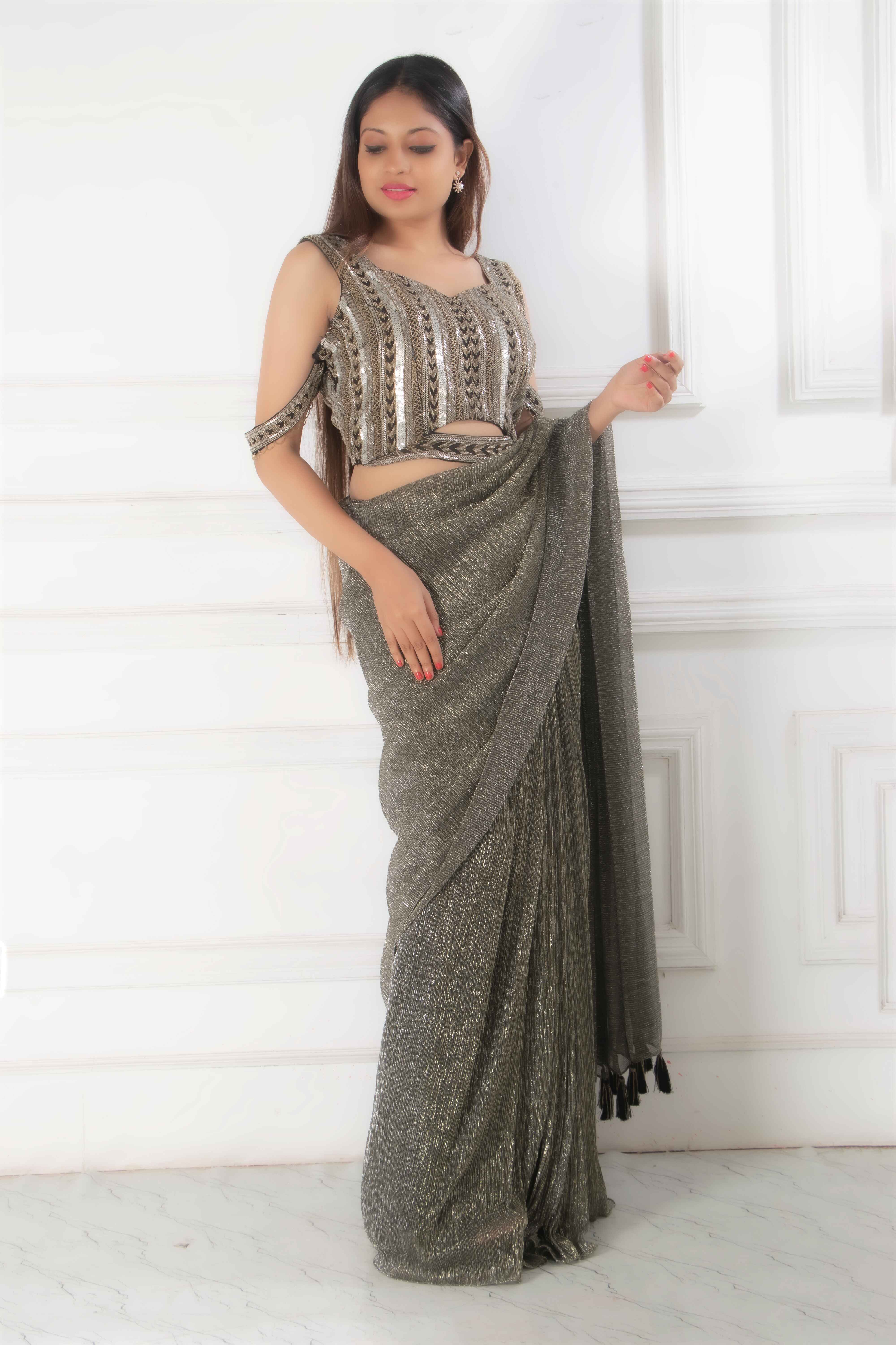 This eye-catching outfit consists of a green and black shimmering saree made from luxurious lurex fa...