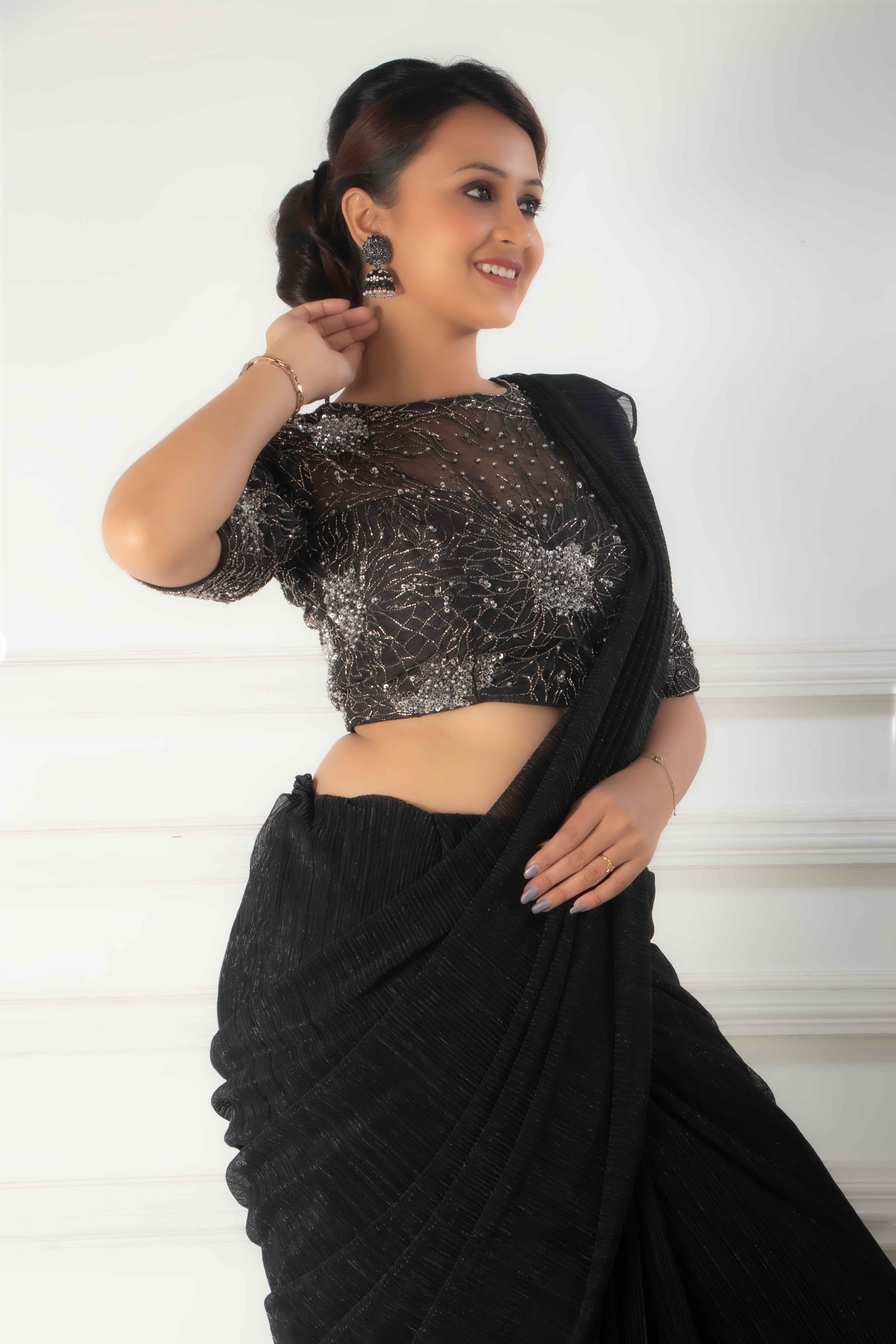 Elevate your evening outfit with this elegant two-tone saree in black and silver. The shimmering fab...