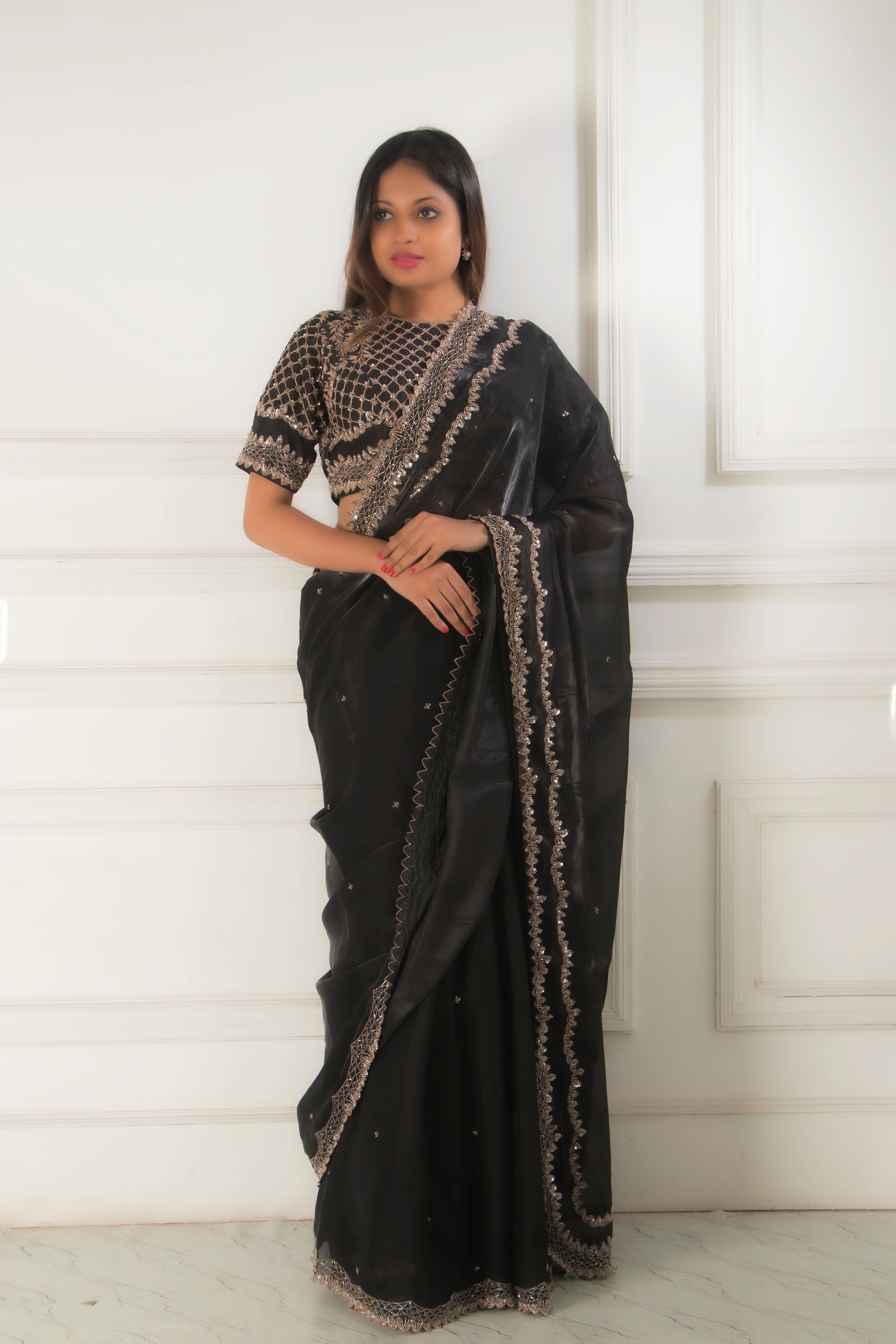 This elegant outfit consists of a solid black organza saree. It is known for its delicate and airy f...